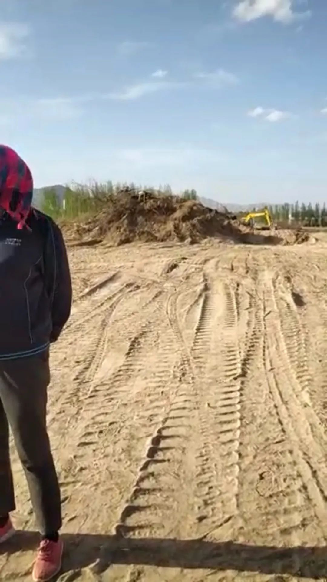 她的身后,一台黄色的挖土机正在轰隆隆地作业。挖土机过处,留下一道道深深的轮胎印迹,如同一条巨大的拉链,撕开了大地。