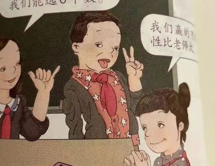 也确实,从“检举”网友贴出的插图看,这位给教材插画的画家确实画术不敢让人恭维。里面的孩子都跟唐氏综合征患者一样,口歪眼小眼距宽,但凡在正经美术学院好好上过课,都不至于画成这样。