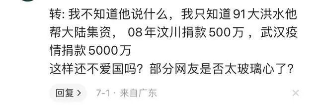 有网友说:“我不知道他说什么,我只知道91年大洪水他帮大陆集资,08年汶川捐款500万,武汉疫情捐款5000万,这样还不爱国吗?”