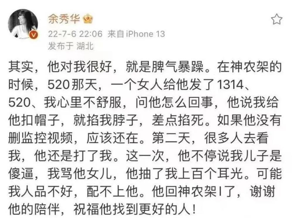 余秀华昨晚发微博说她和小男友分手了,他俩互骂对方子女,男的抽了她上百个耳光,曾经差点掐死她。如果不是艺术夸张,不止是家暴,而是故意伤害了。
