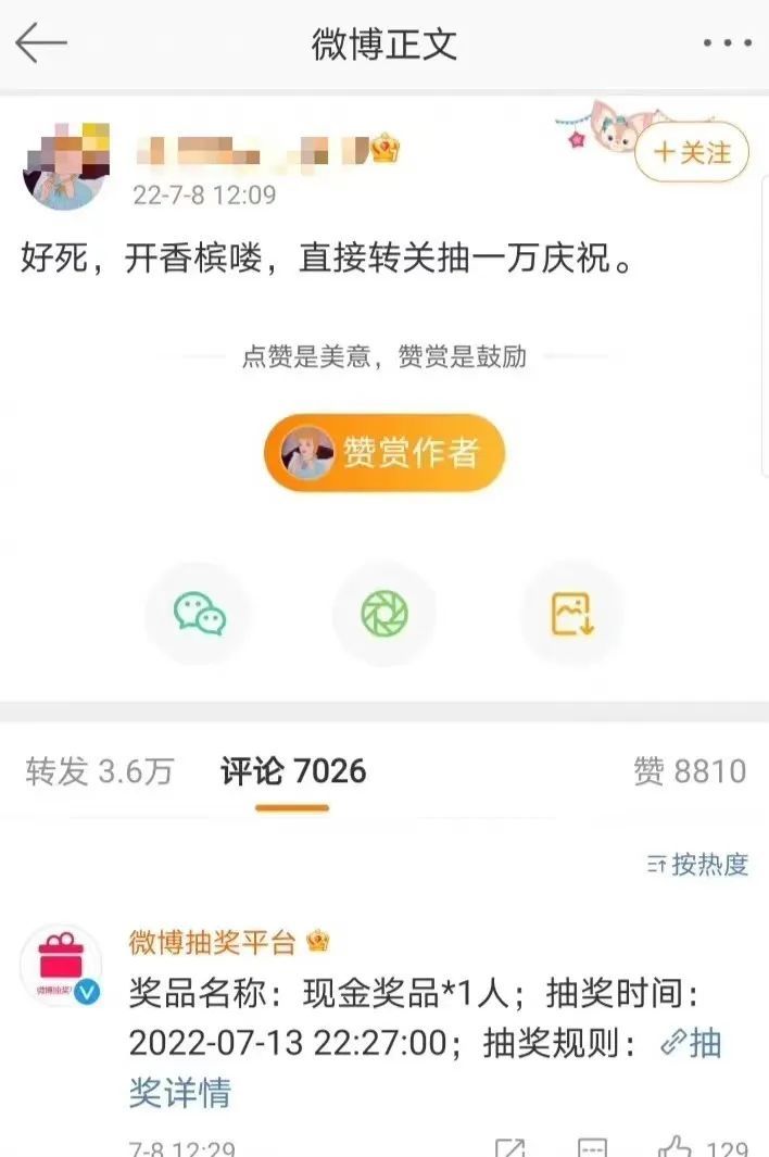 有的博主借势发起了抽奖活动,自述要抽一万助力粉丝开香槟,至于是人民币还是冥币还有待验证: