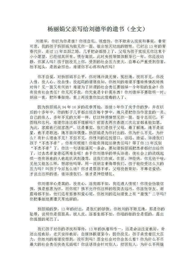 若干年前曾有这么一则新闻,说影星刘德华有个狂热的女粉丝,追星追到倾家荡产、家破人亡,她的父亲后来也跟着她魔怔了,先是割肾后来又跳海,死前留下一份遗书,痛斥刘德华对他女儿的无情。