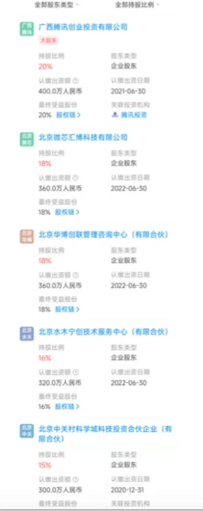 天眼查信息显示,北京微芯感知科技有限公司股权架构中,大股东为广西腾讯创业投资有限公司,持股20%,认缴出资额400万人民币,认缴日期为2021年6月30日;其次是北京微芯汇博科技有限公司,持股18%,认缴出资额360万,但认缴出资日期为2022年6月30日。但这家北京微芯汇博科技有限公司唯一股东为北京微芯区块链与边缘计算研究院。但需要注意的是,搜索“北京微芯感知科技有限公司”,其官方网站https://www.baecsense.com/目前处于无法打开的状态。