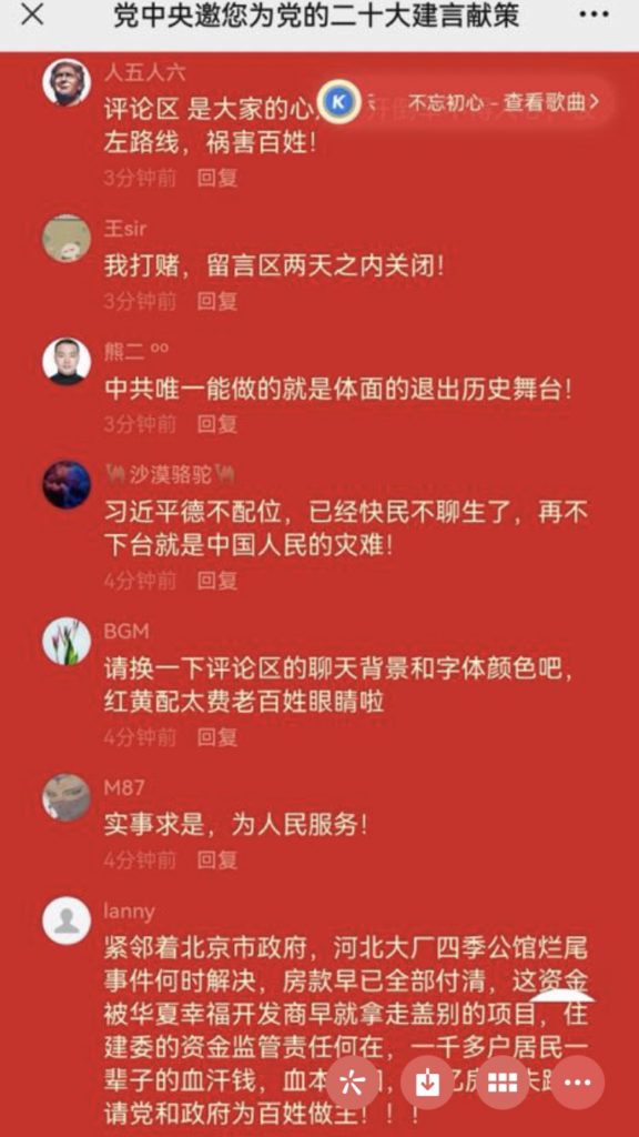 【图说天朝】我也是十四亿分之一,我的微博怎么没被禁言呢? 2022年7月18日 CDT 档案卡 注:大量图片来源不可查,请参看图片水印信息。 标题:【图说天朝】我也是十四亿分之一,我的微博怎么没被禁言呢? 作者:中国数字时代 发表日期:2022.7.18 主题归类:辱包 CDS收藏:话语馆 版权说明:该作品版权归原作者所有。中国数字时代仅对原作进行存档,以对抗中国的网络审查。详细版权说明。 中国数字时代将近期流传于网络上的热门图片(含大量恶搞图)整理成册,制作了最新一期【图说天朝】合集,该系列将不定期更新。本期图片话题涉及:辱包、香港回归25周年、河南村镇银行暴雷、网络审查等。 将鼠标悬停于图片上可显示相关描述 所在分类:◉话语馆,⦿社交平台,▣社交同步,✿图说天朝,▣副头条,今日邮件标签:网络审查,河南村镇银行暴雷,恶搞,香港回归,图说天朝,辱包 相关文章 冷阅c|九边去哪儿了? 【404帖子】评论尸|微博衰落到了什么程度呢?“What is On Weibo”要改名了 【404文库】中国数字时代2025年10月404文章统计 【404文库】海边的西塞罗|老西觉得,胡锡进老师说的对 木蹊说|胡锡进开始抱怨“社会宽容度变低”