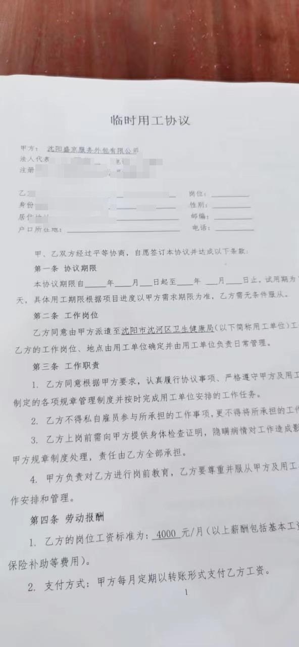 张涵提供的临时用工协议中显示,乙方同意由甲方派遣至沈阳市沈河区卫生健康局工作,乙方的工作岗位、地点由用工单位确定并由用工单位负责日常管理。同时,该份临时用工协议中也明确规定岗位工资标准为4000元一月,甲方每月的15日,以转账形式支付乙方工资。