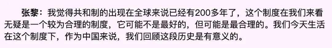 张黎回应:“我觉得共和制出现在全球来说已经有200多年了,这个制度在我们看来无疑是一个较为合理的制度,它可能不是最好的,但可能是最合理的。我们今天生活在这个制度下,作为中国来说,我们回顾这段历史是有意义的。”