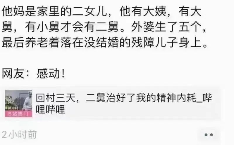 眼见“二舅”这个假人物被戳穿,这个假“外甥”马上发文告示大家:“我已经让宁宁开车把二舅和姥姥从视频中的那个小山村接走了……住在某个不会被任何人打扰的地方。”