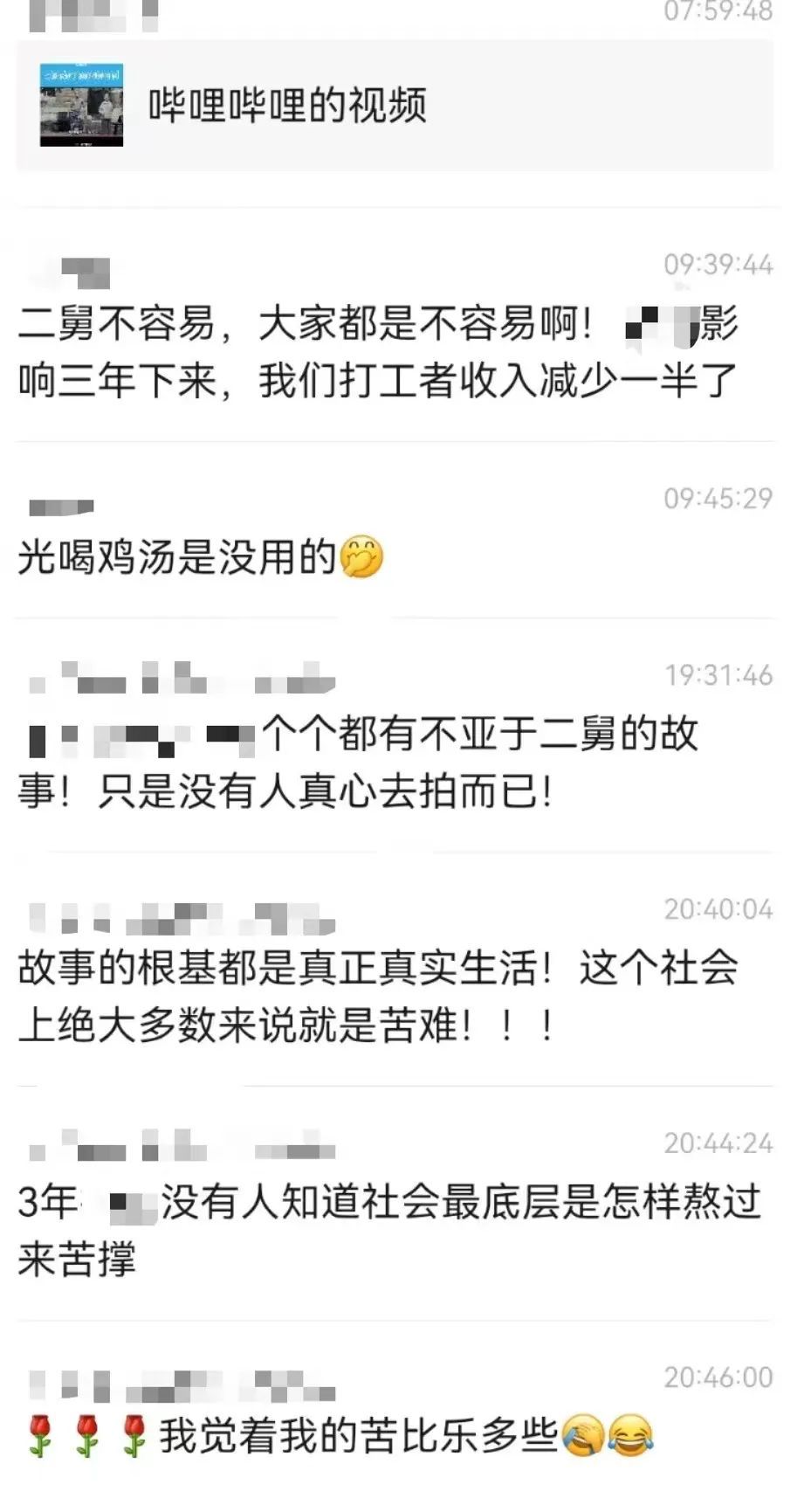 苦难叙事对于公众的情感触动,往往根植于公众领域内部的现实性的共同经验。公众情感并非是碎片化或主观化的,而是对当下社会现状的结构性反映。它关乎公众的理性与感性,更关乎这个社会的真实[1]。「二舅」的故事触及**了三种苦难:二舅自己的苦难、二舅故事背景中其它角色的苦难(比如二舅收养的被遗弃女童)、观看视频的城市居民的苦难。**其中,最后一种是叙述者声称自己经历的痛苦,也是该视频预期的受众–需要治疗「精神内耗」的人–的困境,是该视频产生的直接原因。