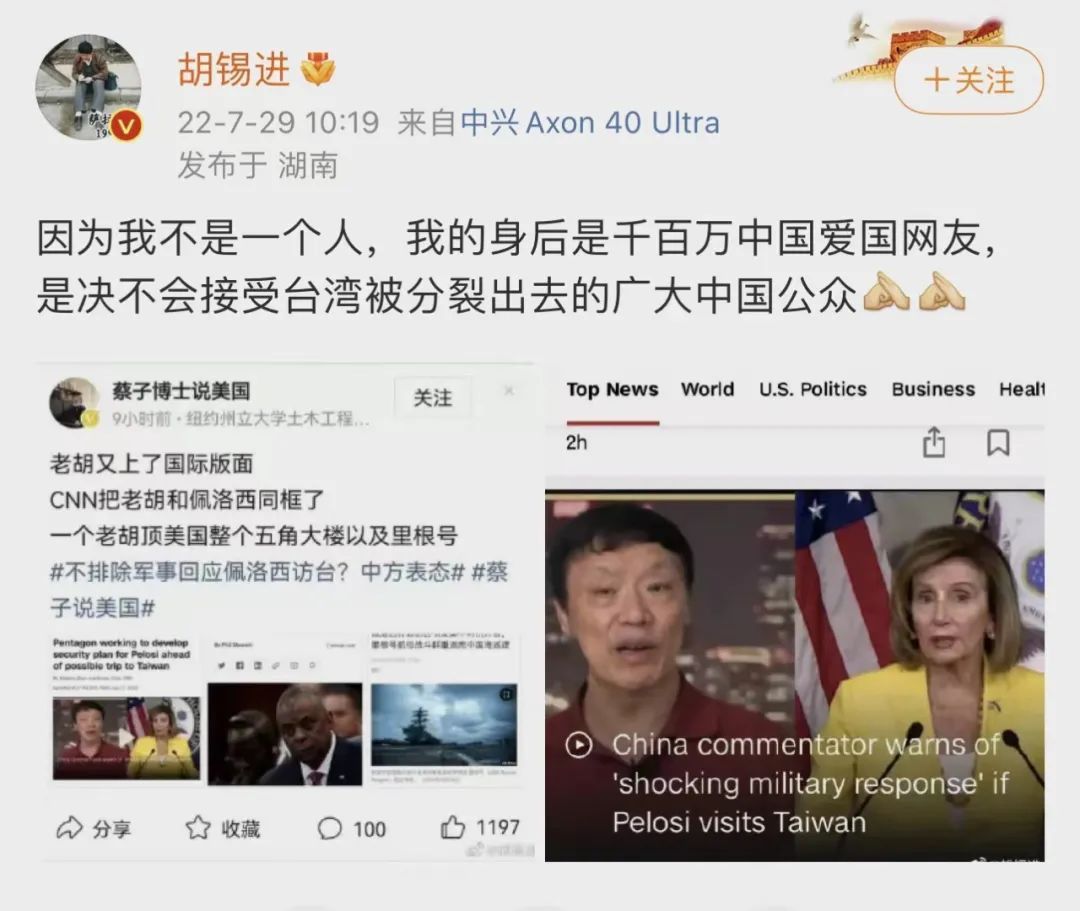 不得不说,佩洛西窜访不管成功与否,胡锡进这波已经达到了扬名立万的目的,流量哗哗的,他或成最大赢家了!