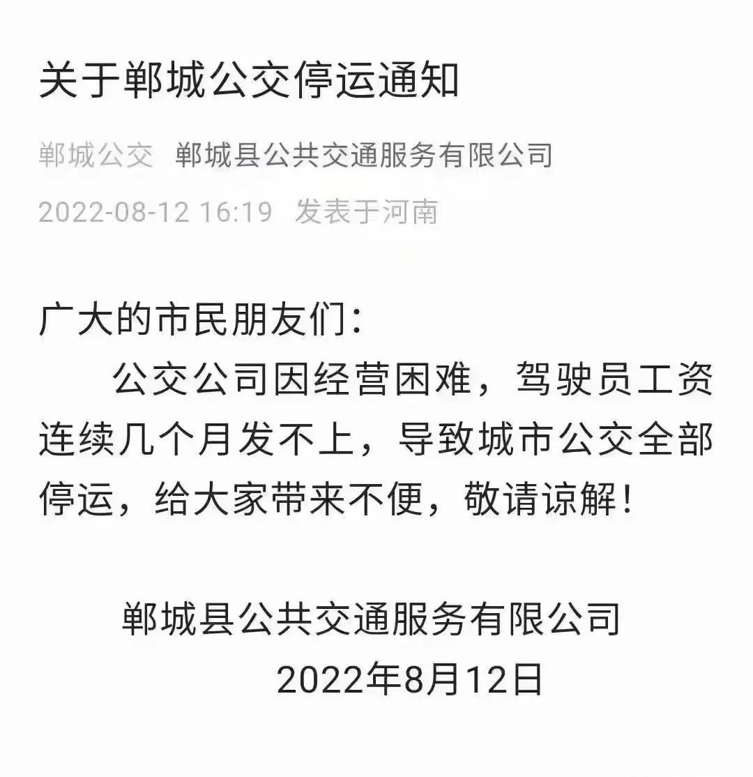因为连续几个月发不出工资,河南郸城县全城公交车停运了,而且还发在网上,显然是为了逼宫。大家都知道,公交公司一般都是国营,因为要承担社会责任,人少的线路也得照常开,票价还不能随意涨。