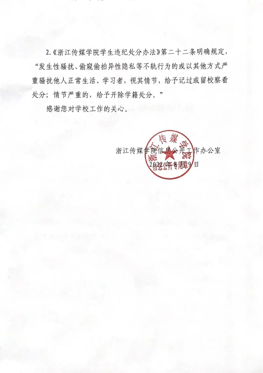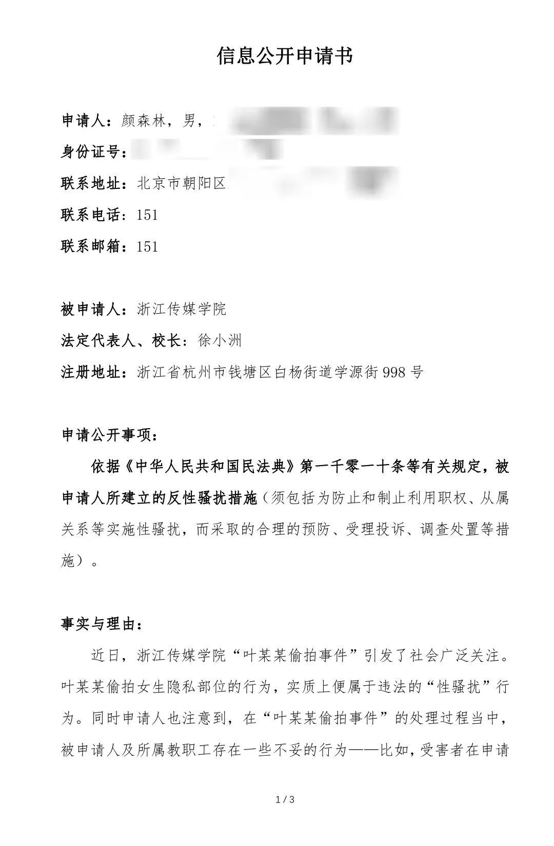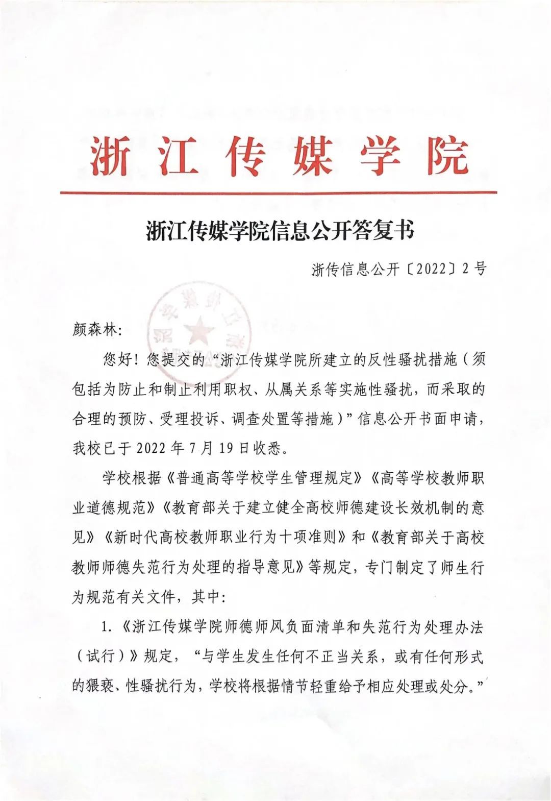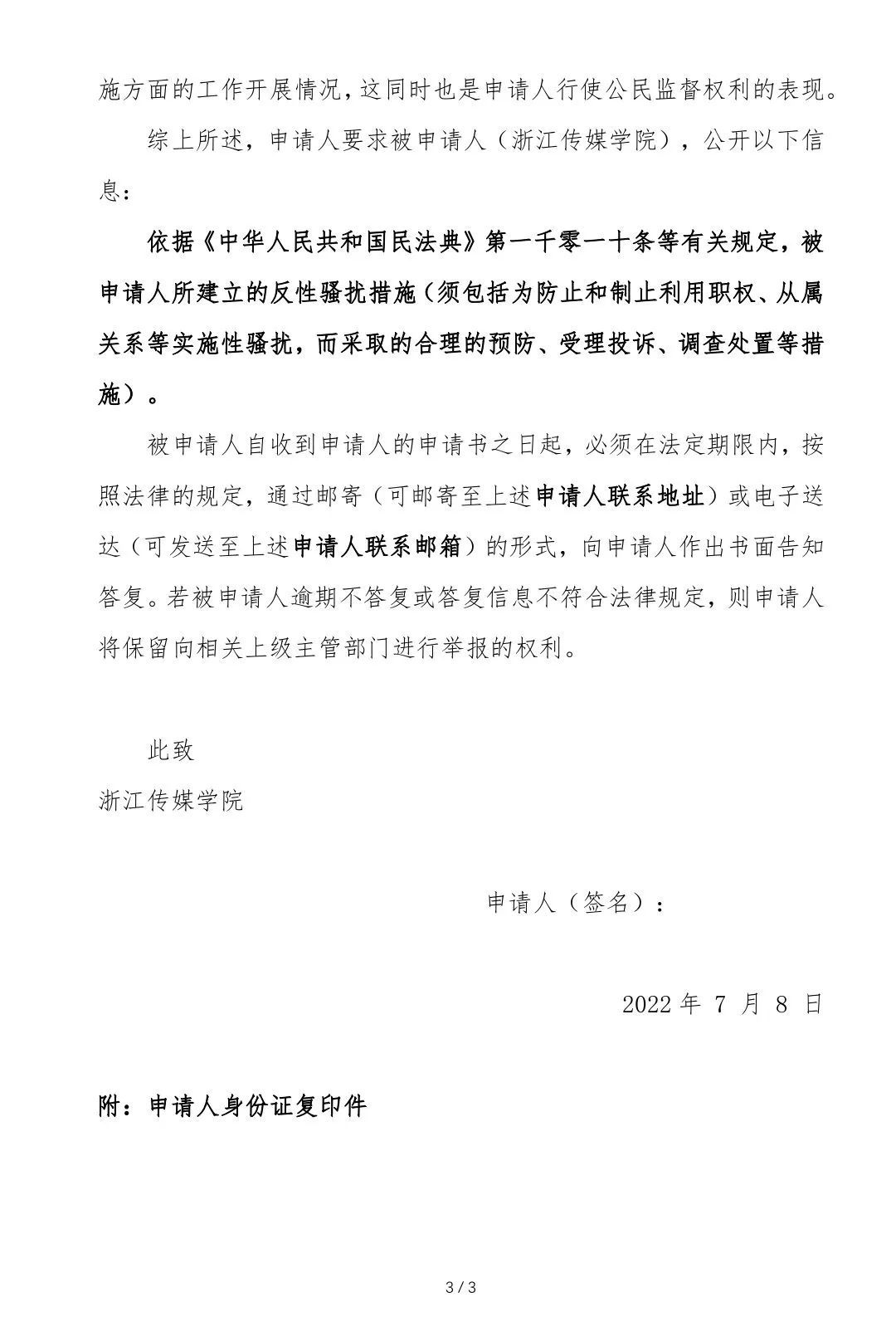 前段时间浙传发生“叶某某偷拍事件”以后,7月8日,我向浙传提交了关于“反性骚扰”的信息公开申请。申请浙江传媒学院公开以下信息——依据《中华人民共和国民法典》第一千零一十条等有关规定,浙江传媒学院所建立的反性骚扰措施(须包括为防止和制止利用职权、从属关系等实施性骚扰,而采取的合理的预防、受理投诉、调查处置等措施)。