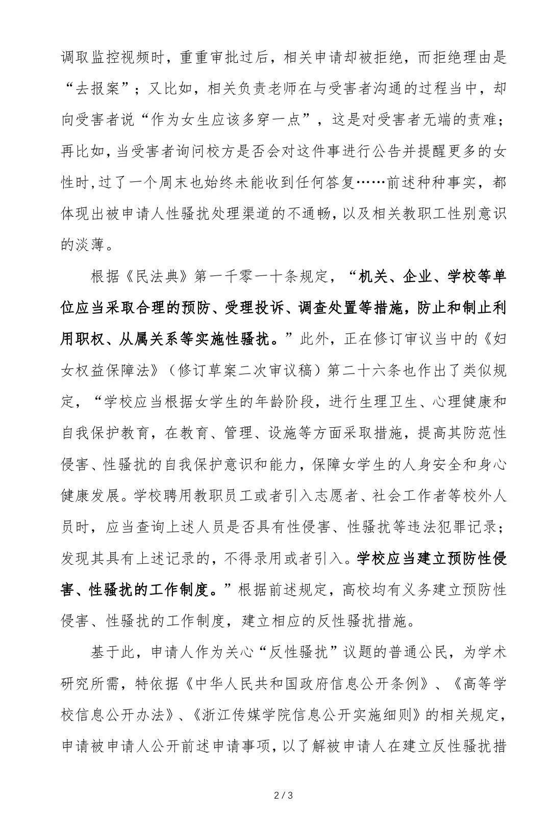 二是请浙江省教育厅督促浙江传媒学院尽快履行民法典第1010条所规定的法定义务,制定反性骚扰的专项制度文件。