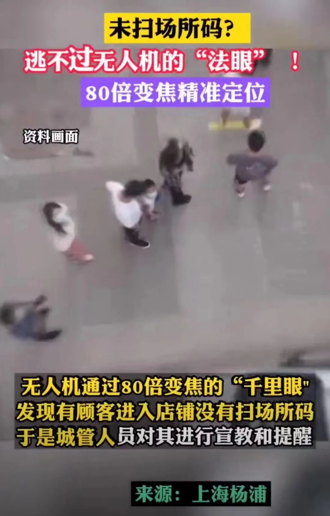 此前有一位顾客进入店铺没有扫场所码,就被无人机通过80倍变焦的“千里眼”发现了。