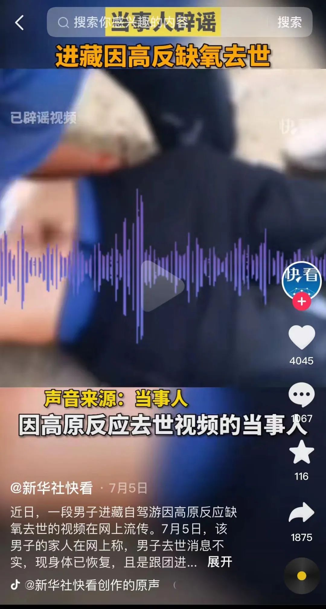 实际上,在老妈跟我说这个事之前,我都已经看过辟谣的报道了,当事人根本没死。然而,事实虽然反转了,但剪辑成各种版本的【男子进藏缺氧去世】视频还是在各大平台上继续流传。被误导的除了我妈,也可能有你的父母和亲人。