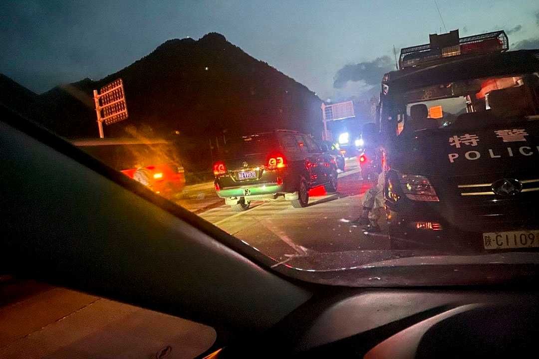 入夜后,堵在车前的特警车辆。图:受访者提供