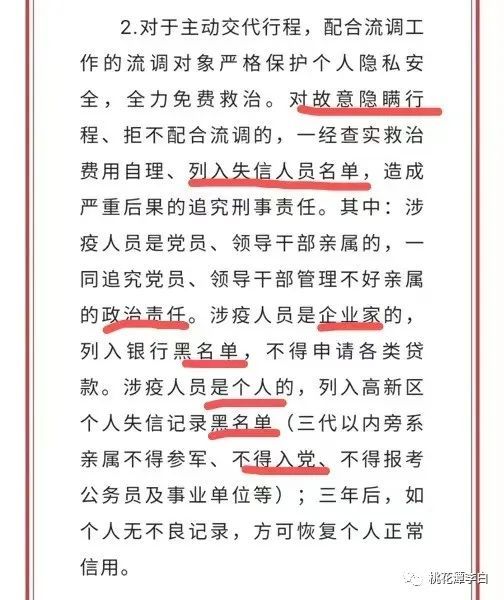 其中:涉疫人员是党员、领导干部亲属的,一同追究党员、领导干部管理不好亲属的政治责任。涉疫人员是企业家的,列入银行黑名单,不得申请各类贷款。涉疫人员是个人的,列入高新区个人失信记录黑名单(三代以内旁系亲属不得参军、不得入党、不得报考公务员及事业单位等);三年后,如个人无不良记录,方可恢复个人正常信用。