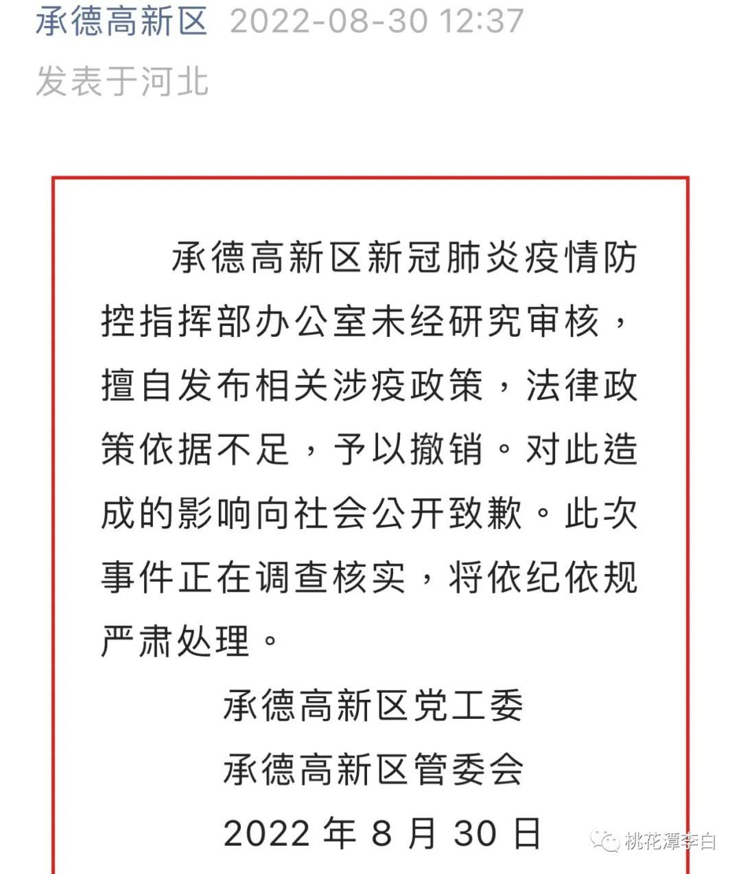 果不其然,公告出来十几小时后,承德高新区发布新通报。说前面这则公告,是承德高新区新冠肺炎疫情防控指挥部办公室,擅自发布的涉疫政策,没经过研究审核。法律政策依据不足,予以撤销。对此造成的影响,向社会公开致歉。