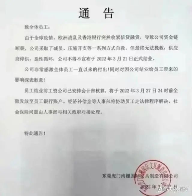 比如在2022年3月份,曾占全球文具夹市场份额超过60%的东莞另一家港资大企业南栅文具集团也宣布停业,停业的理由跟爱高电业如出一辙,都是疫情、战乱、银行信贷收缩等等。