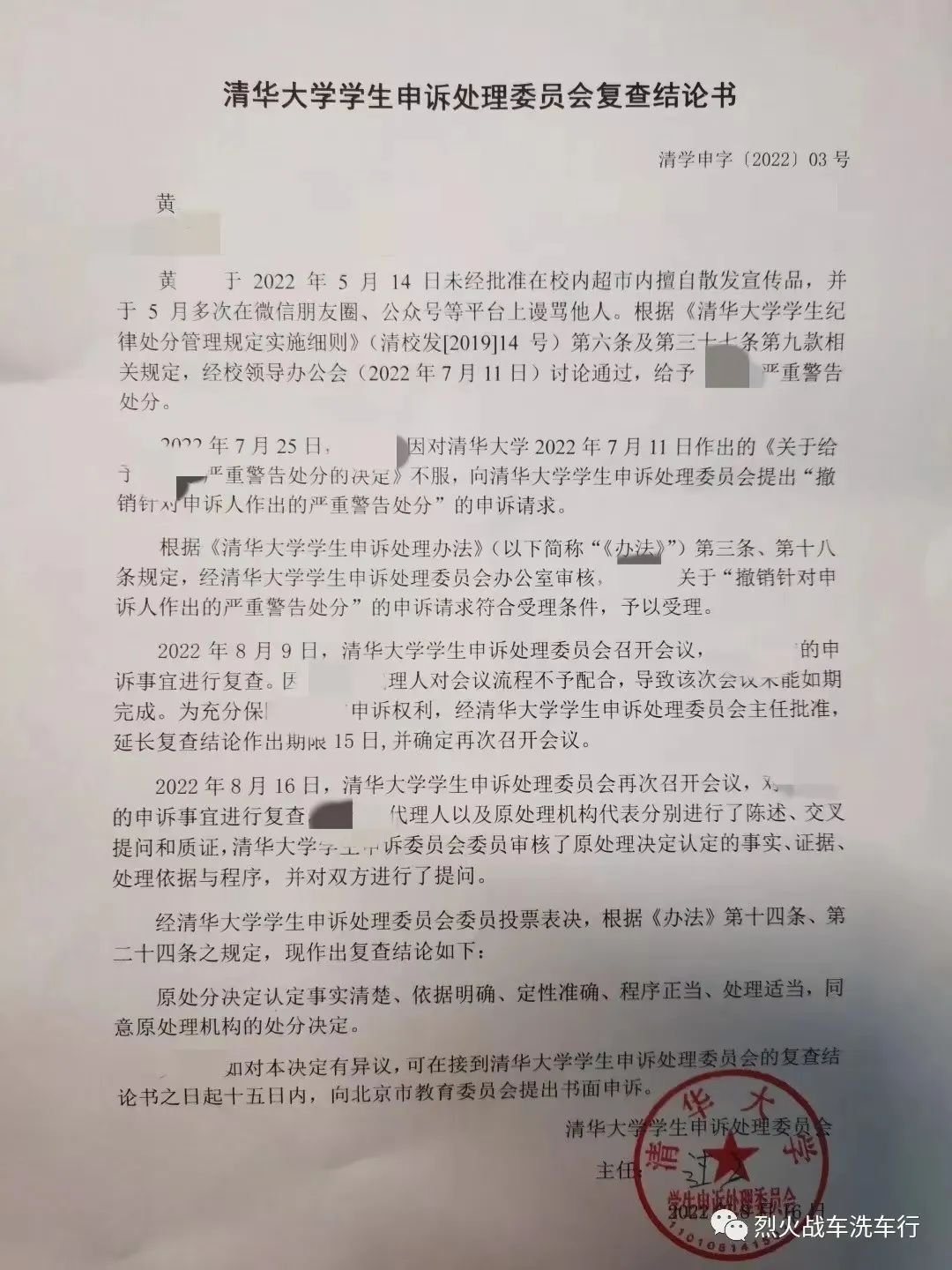 8月,两位当事人李同学与黄同学相继收到了清华大学学生申诉处理委员会作出的复查结论书,复查结论书均维持了原来的处分决定。