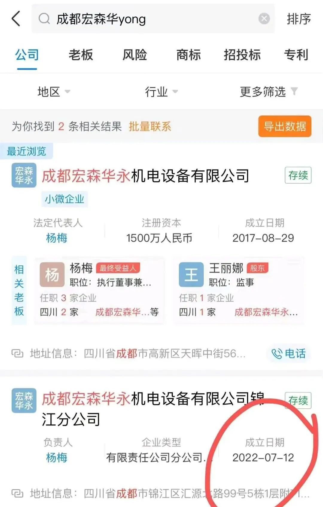 这家公司今年7月12日才成立,负责人叫杨梅;其总公司成立于2017年8月,负责人是同一人,参保人数为6人。
