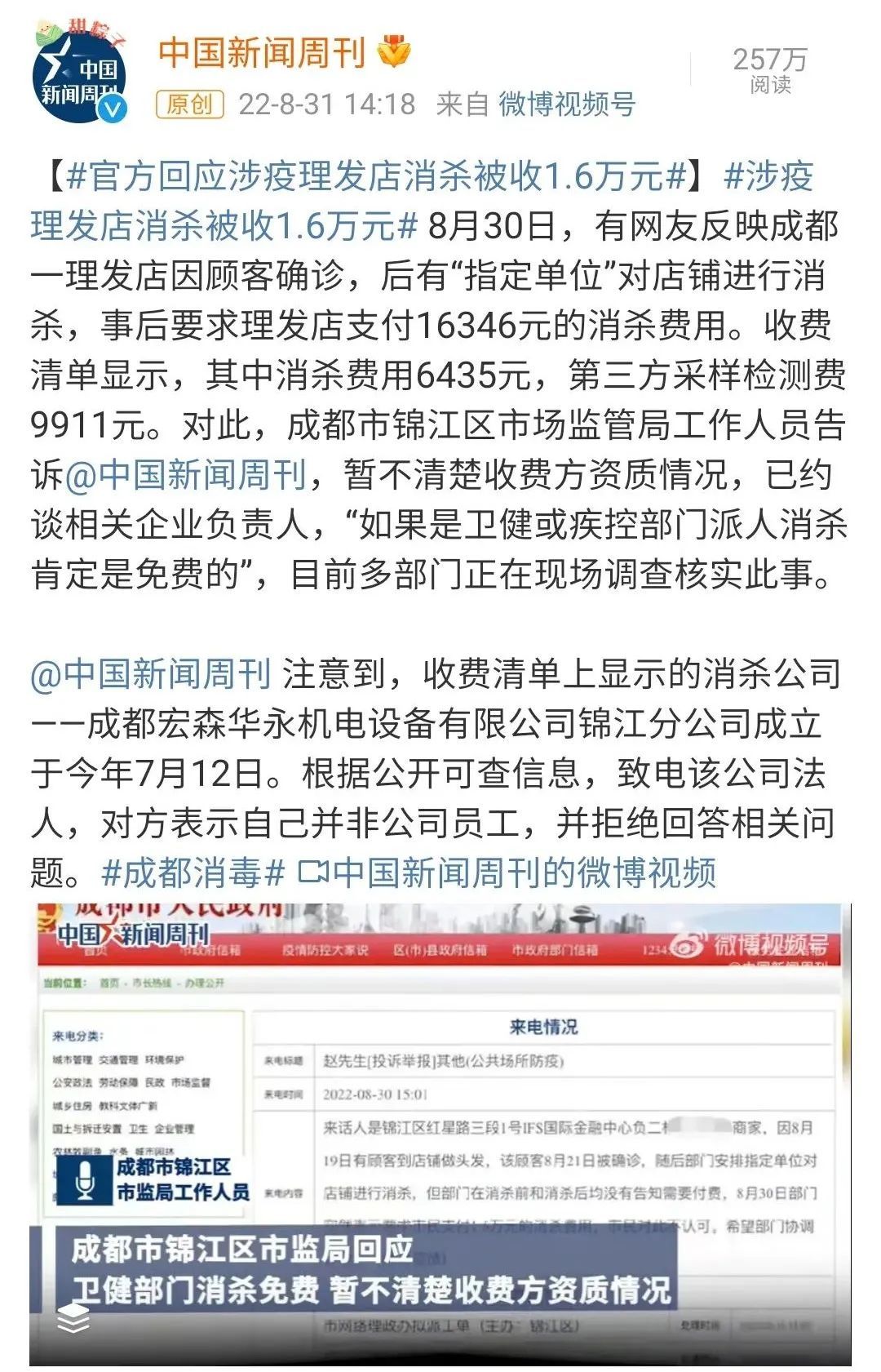 成都市一家理发店因有顾客确诊,一个指定单位——成都宏森华永机电设备有限公司锦江分公司——进行上门消杀,收费16346元,其中消杀费用6435元,第三方采样检测费用9911元。