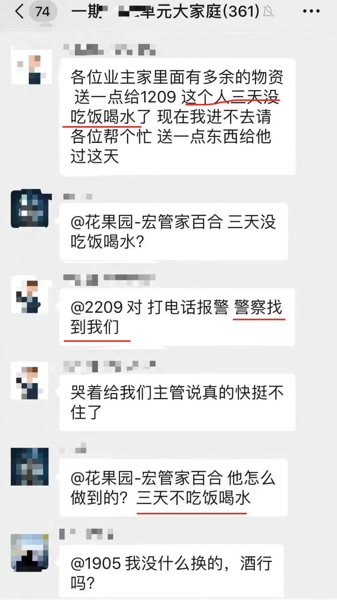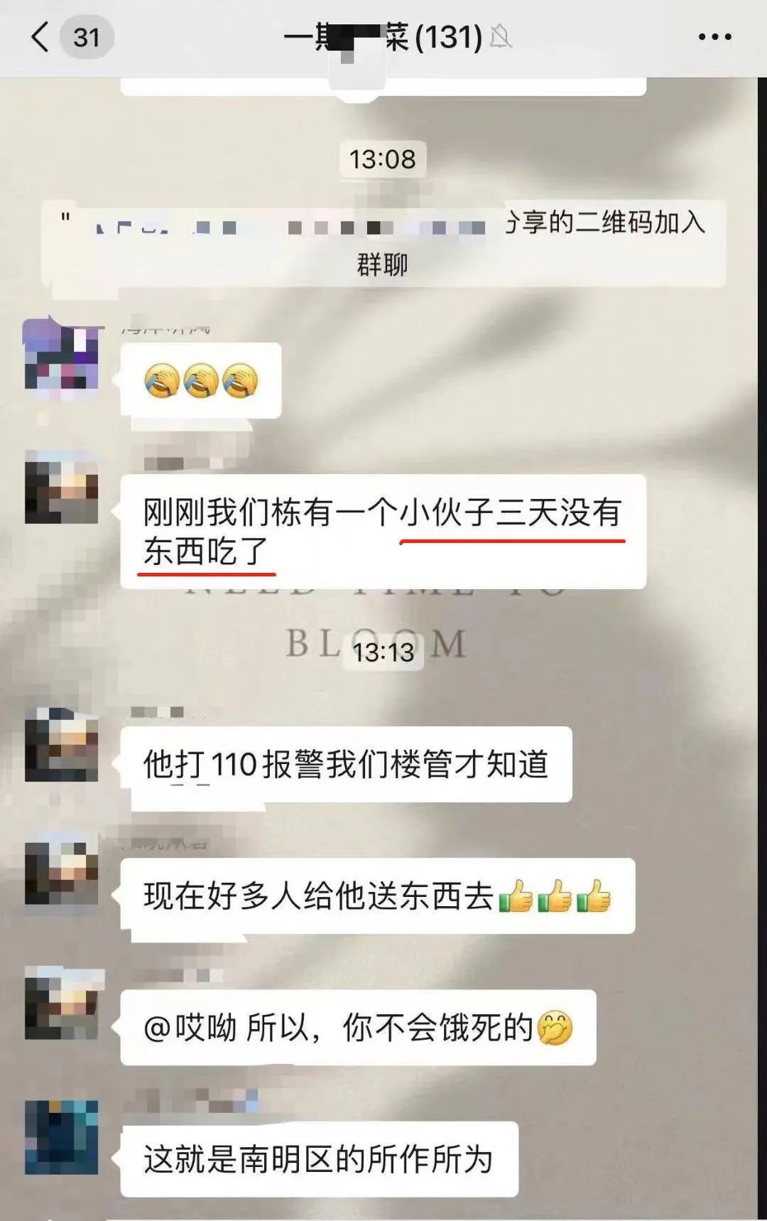“我们楼栋有个小伙三天没吃东西了,他报警我们楼管才知道,现在好多人给他送吃的。”