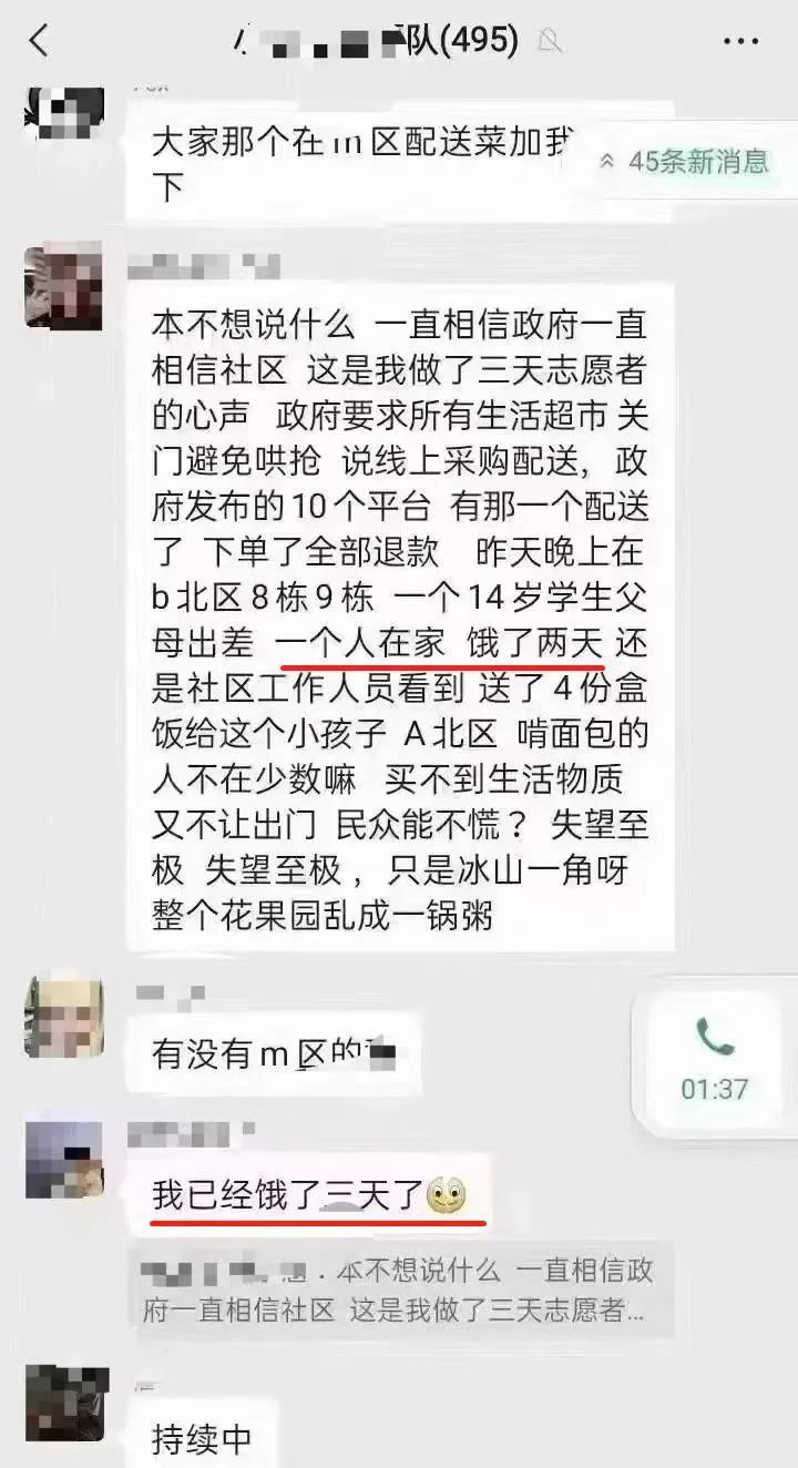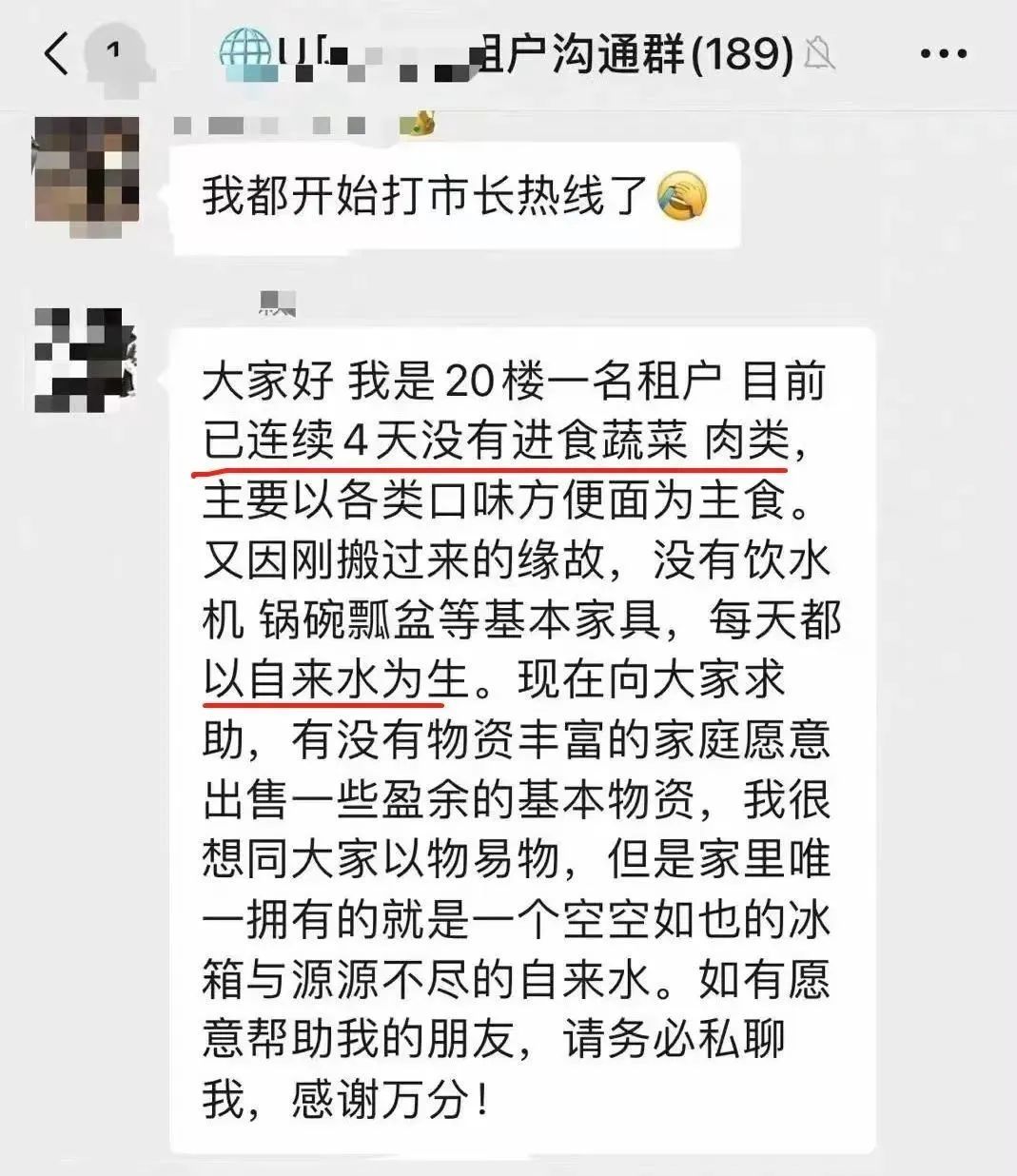 “哪位业主家里还有剩饭的,愿意给出一点的,这边有好多租户都是饿了一天两天的,可以的话给他们一口饭吃吧!”