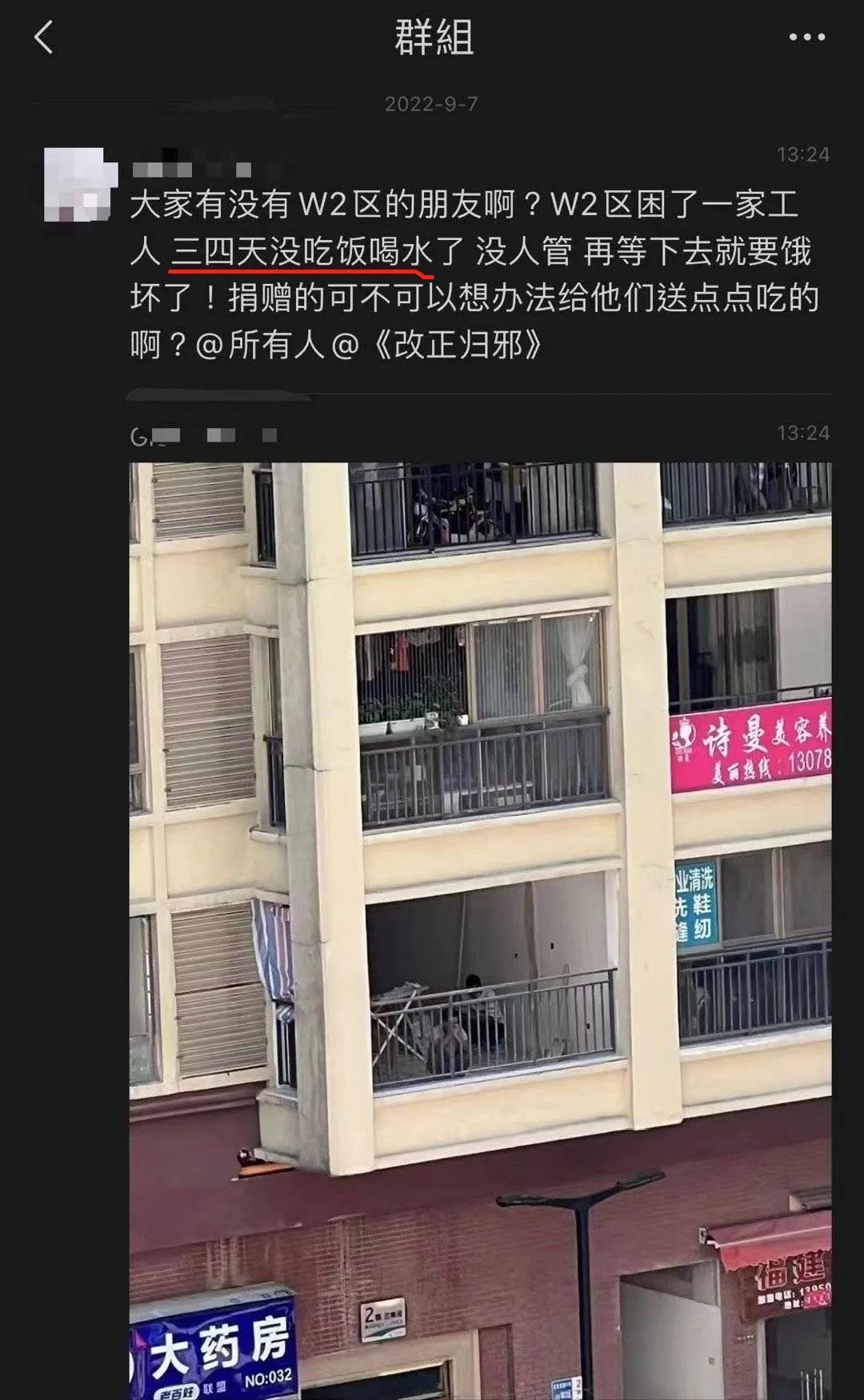 还有人发现小区困了一家工人,三四天没吃饭喝水,没人管。