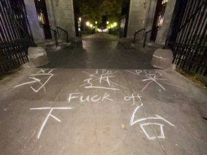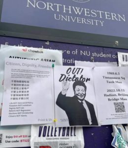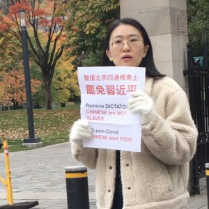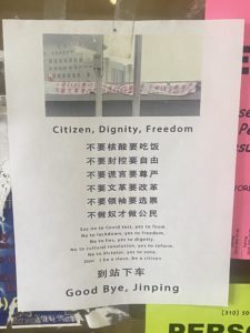 10月13日,在中共二十大召开前夕,北京市海淀区北三环西路四通桥一处高架上惊现抗议标语,两条白底红字的巨型横幅相隔着“四通桥”的蓝色指示牌悬挂着展开,较长较大的一条横幅上写着两排文字“不要核酸要吃饭,不要封控要自由,不要谎言要尊严,不要文革要改革,不要领袖要选票,不做奴才做公民”,而另一条短横幅上则写着反习内容——“罢课罢工罢免独裁国贼习近平”。