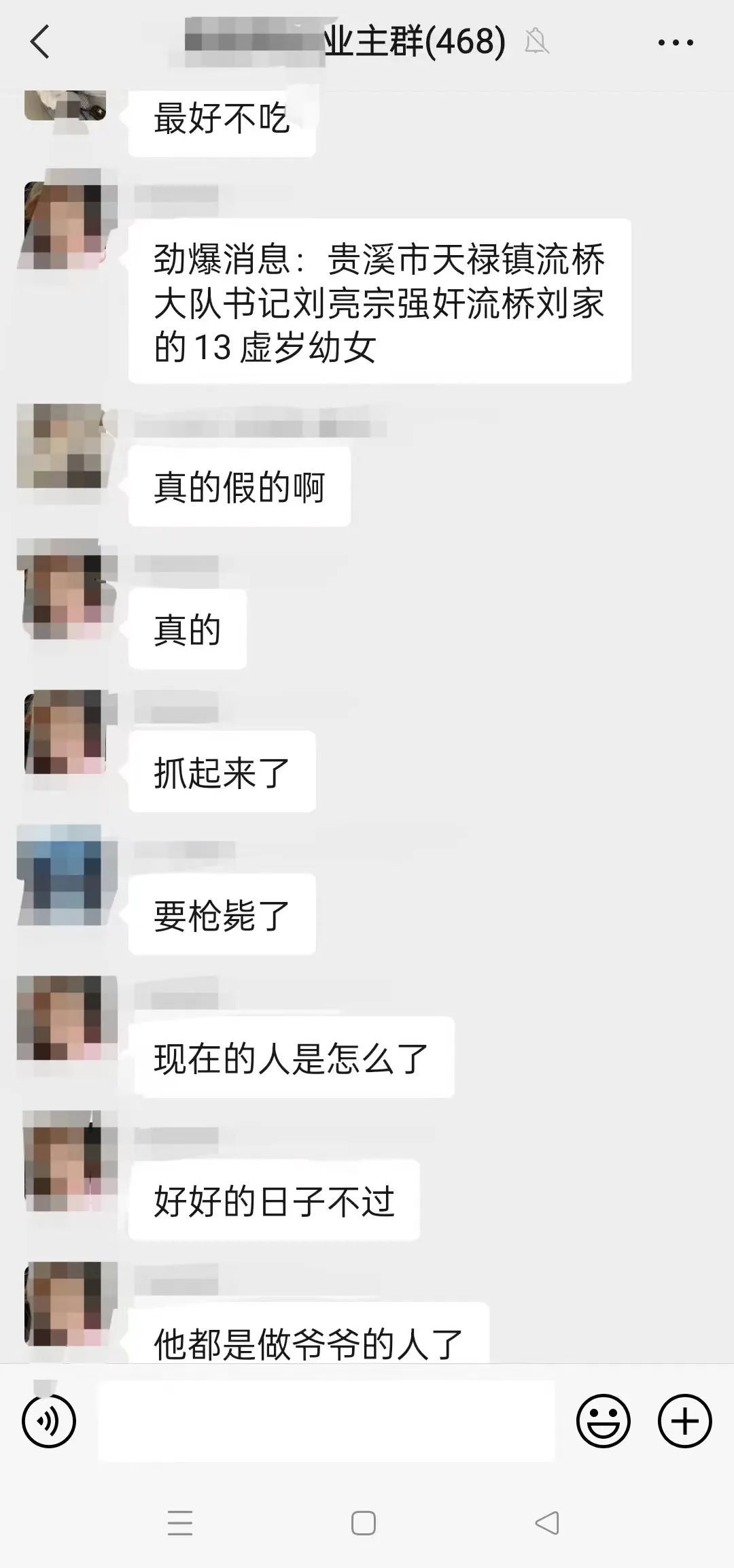 网传的当地居民相关聊天信息显示,居民称,被刘亮宗强奸的12岁女童“回家后一身血”,经家人询问后得知被强奸;