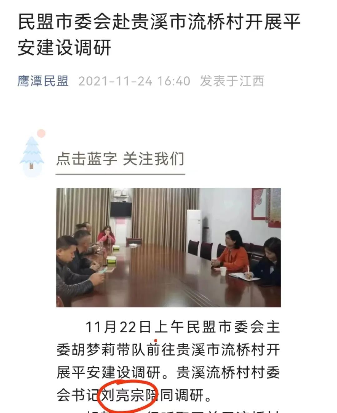 该文章称,2021年11月22日,民盟市委会主委胡梦莉带队前往贵溪市流桥村开展平安建设调研。流桥村支书刘亮宗陪同调研。