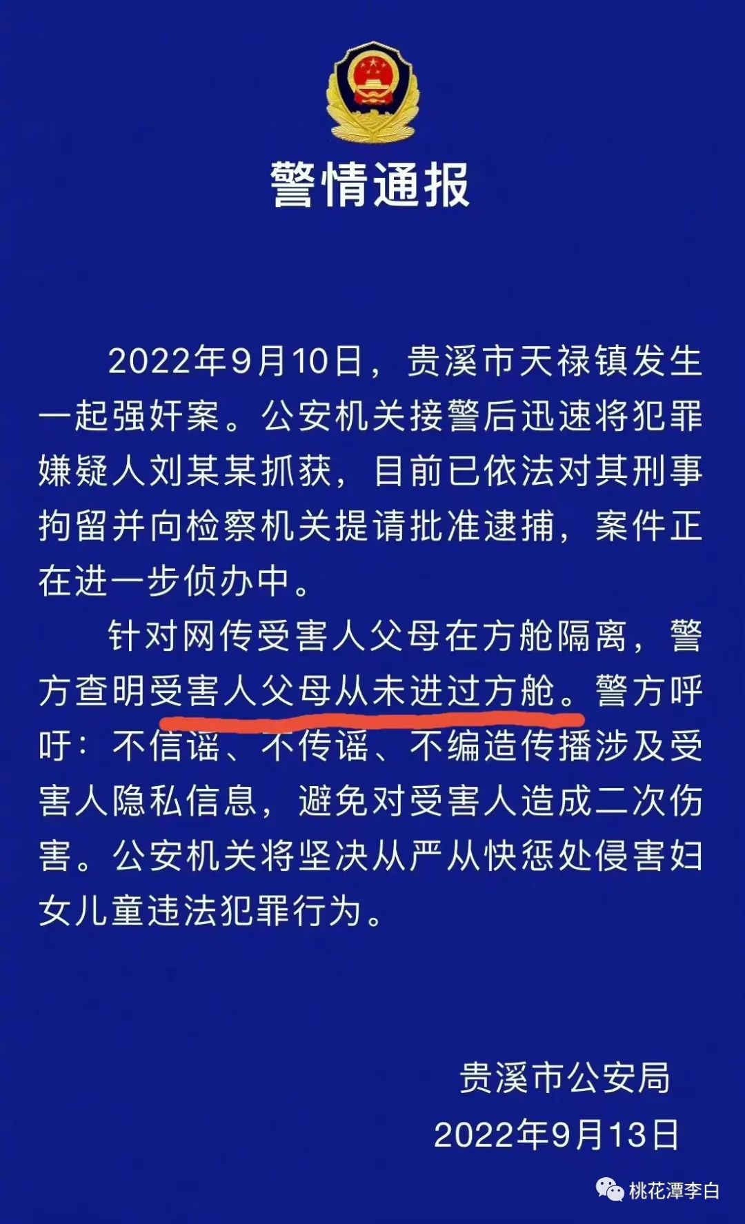 第四,13日,网友们等来贵溪市公安局第一份通报。主要讲四点:1、有强奸这事;2、村支书已被逮捕;3、被害人父母从未进过方舱;4、不信谣不传谣。这份通报,一下把这件事推向了另一个高潮,引发了更强烈的二次舆情。