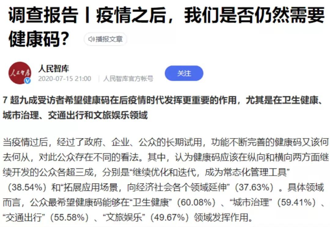 “超九成受访者希望健康码在后疫情时代发挥更重要的作用,尤其是在卫生健康、城市治理、交通出行和文旅娱乐领域”。