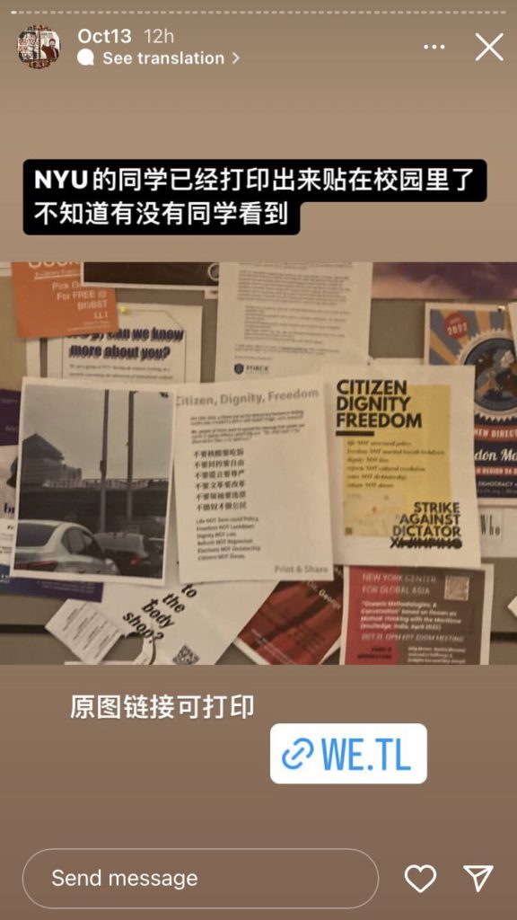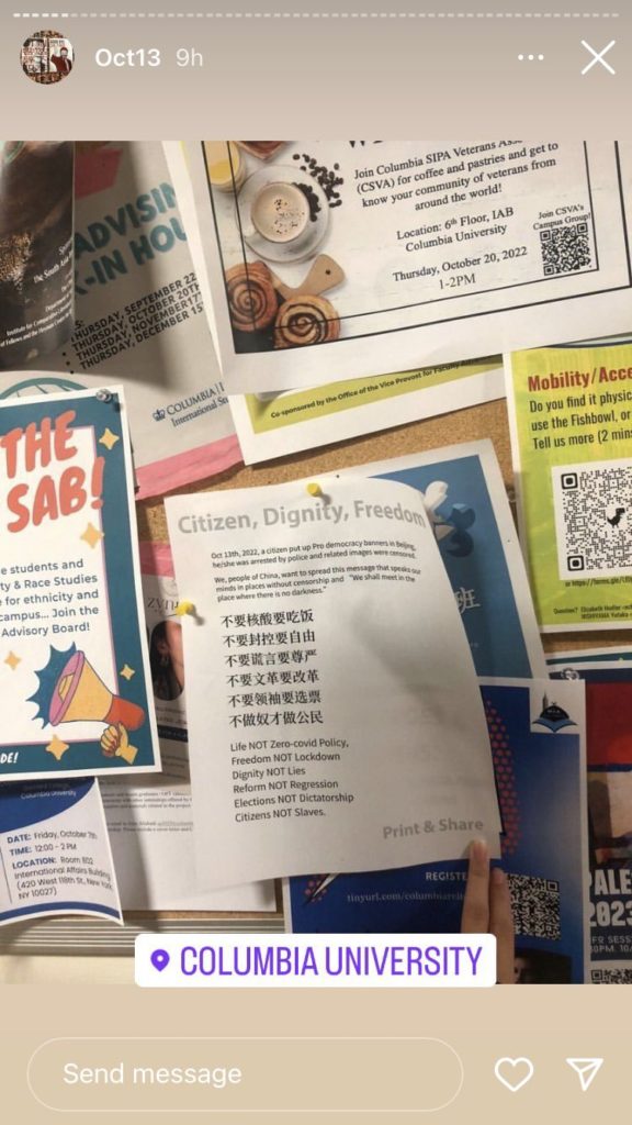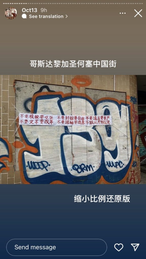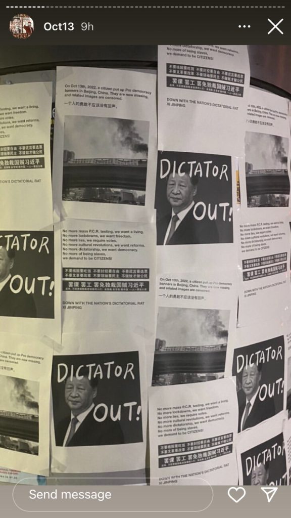 北京四通桥抗议后,海内外多地出现标语反对习近平连任。此外,社交媒体上的图片显示,北京多处道路桥梁均有穿着印有“中国民兵”、“志愿者”字样的守卫站岗。