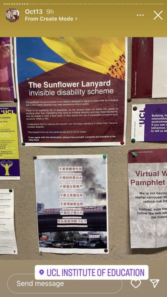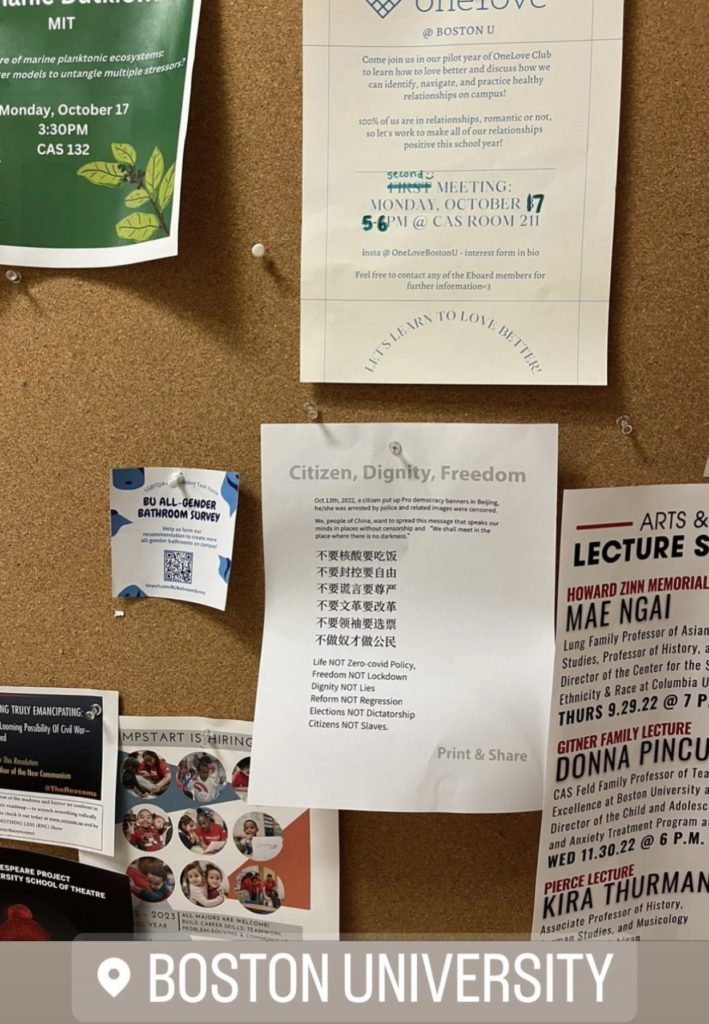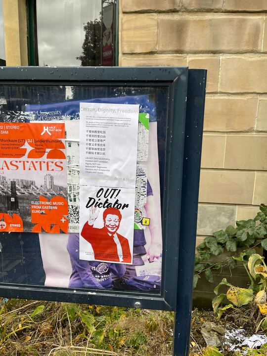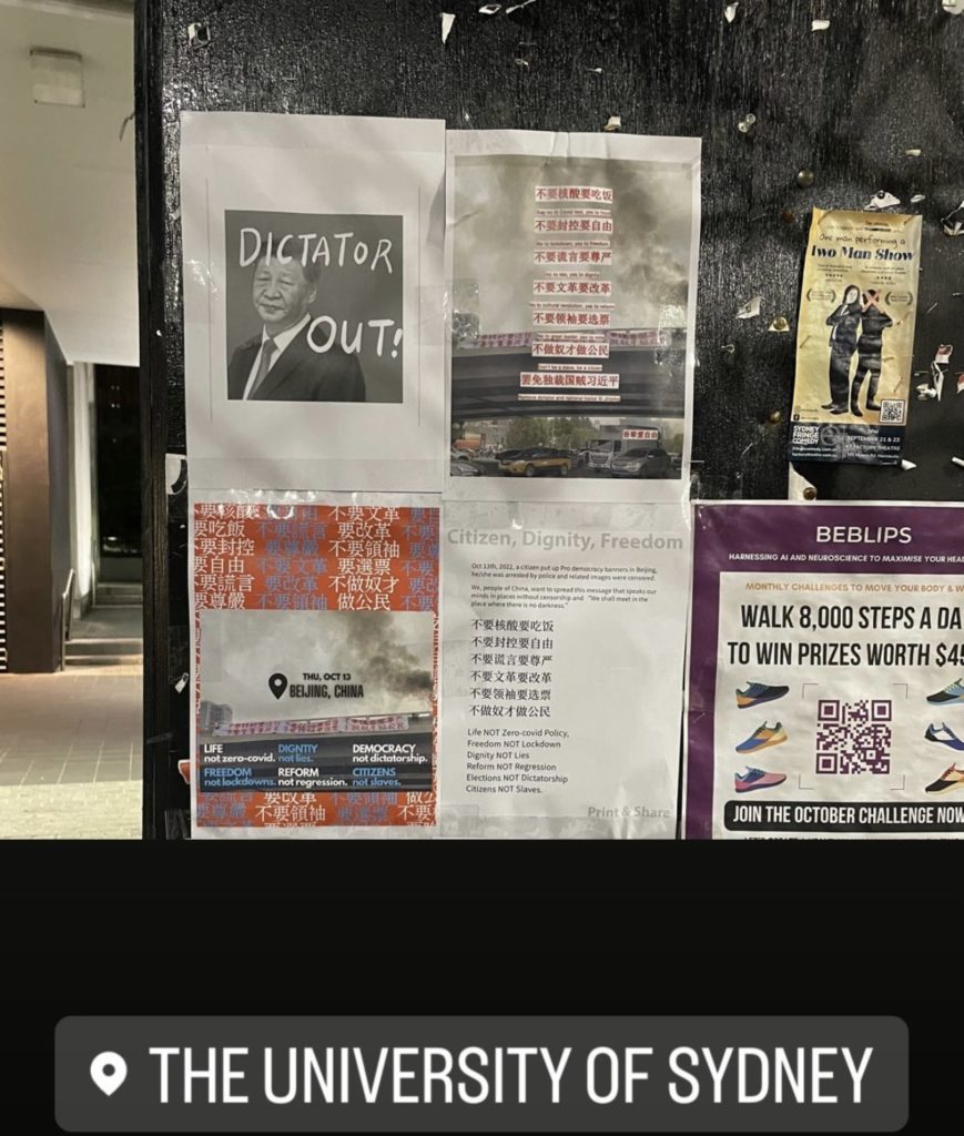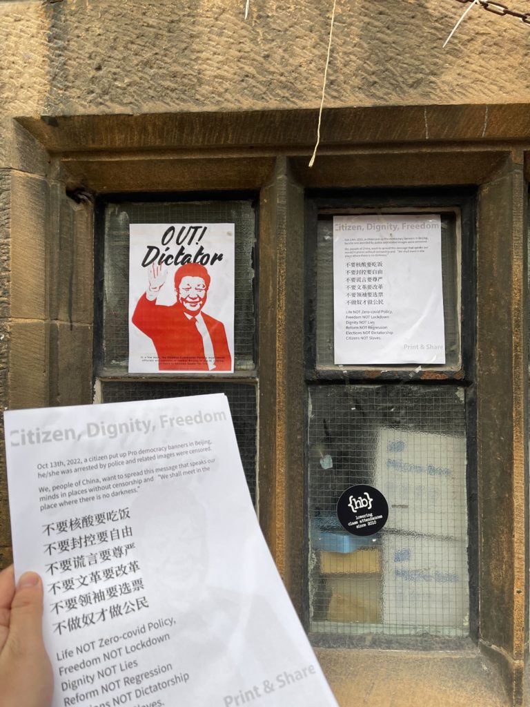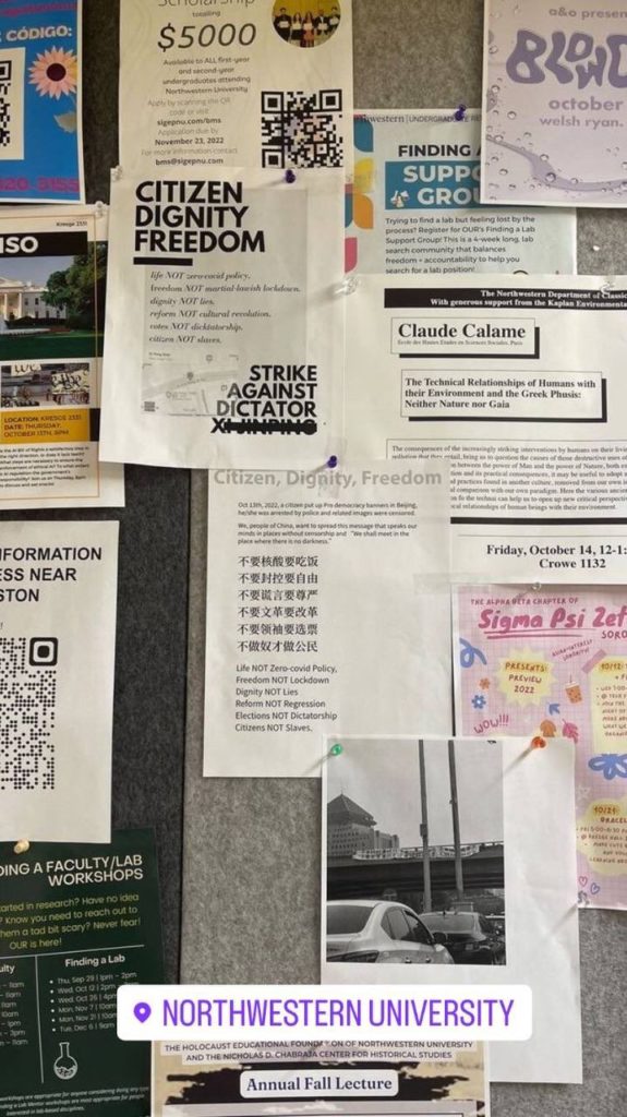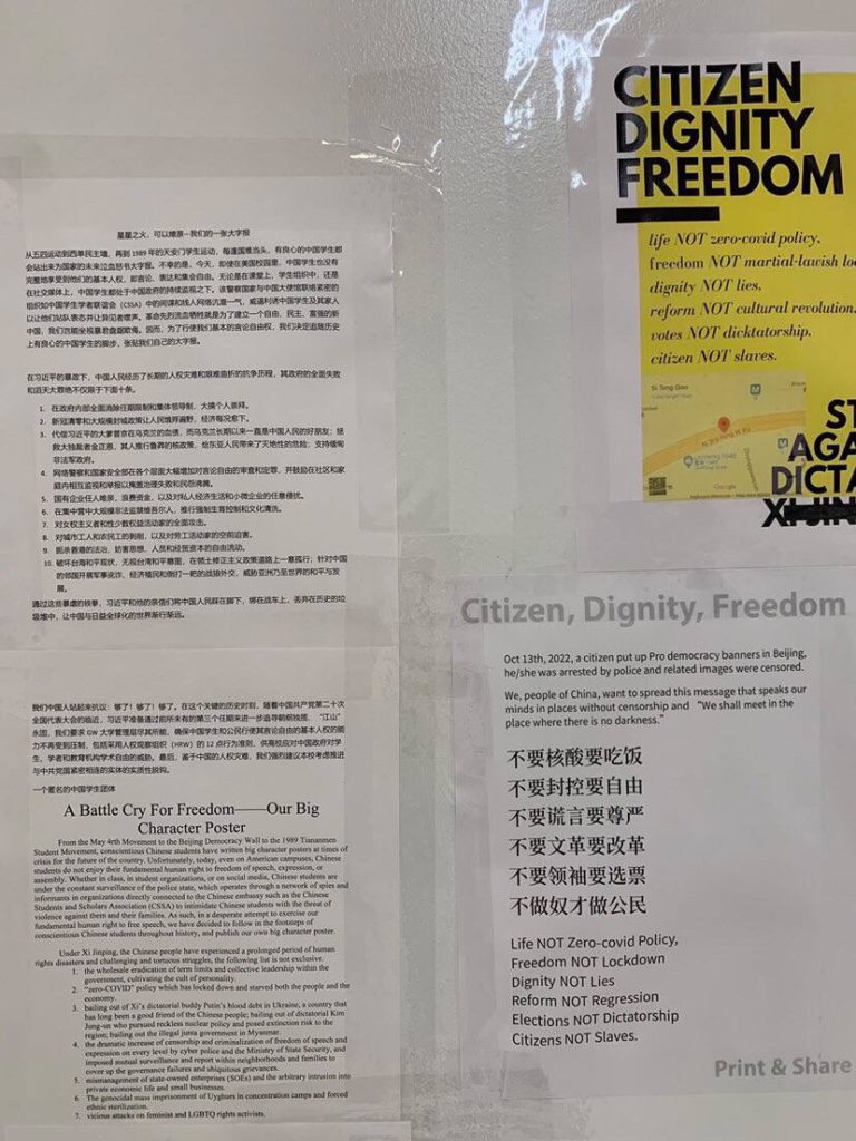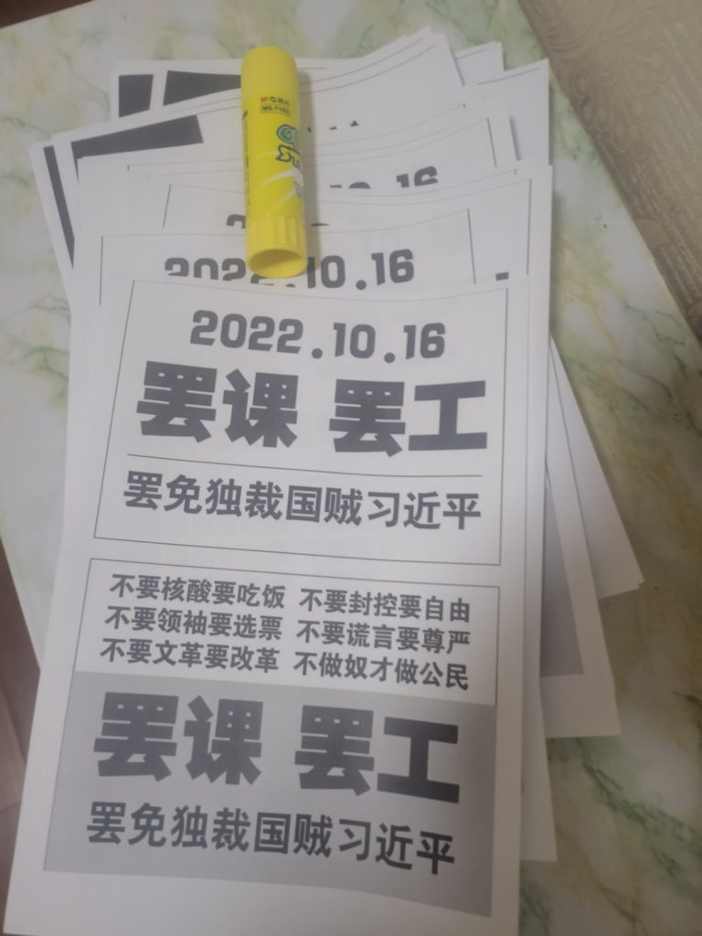 2022年10月16日凌晨,西安市民发现交大北门对面公交车亭、咸宁路共享自行车充值窗口、兴庆路检测亭、八仙庵外街边车身上的标语: