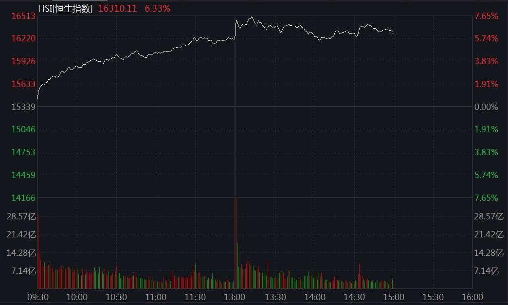 恒指强势收复16000点,拉涨近1000点;恒生科技指数午后飙升逾10%。截至15时,恒指涨近970点,涨幅6.31%,报16307.27点;恒生科技指数涨255点,涨幅8.42%,报3290.87点。
