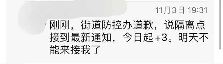 19:30 街道防控办工作人员来电致歉「真的**不好意思啊,**我们明天不能来接你了。你这边要+3天管理(我:为什么呢?)这个我们也不清楚,这是疾控的意思。」