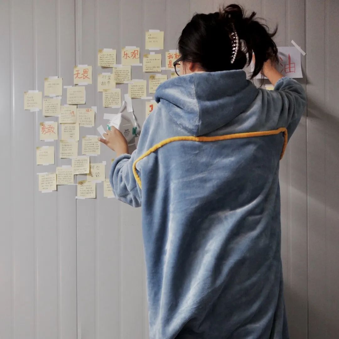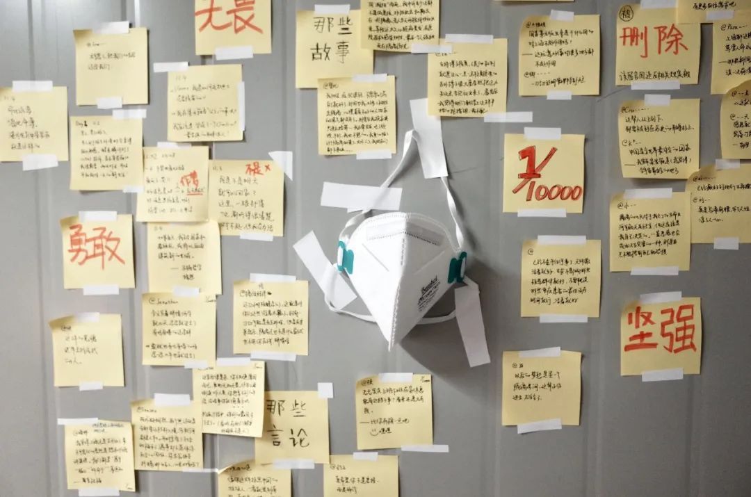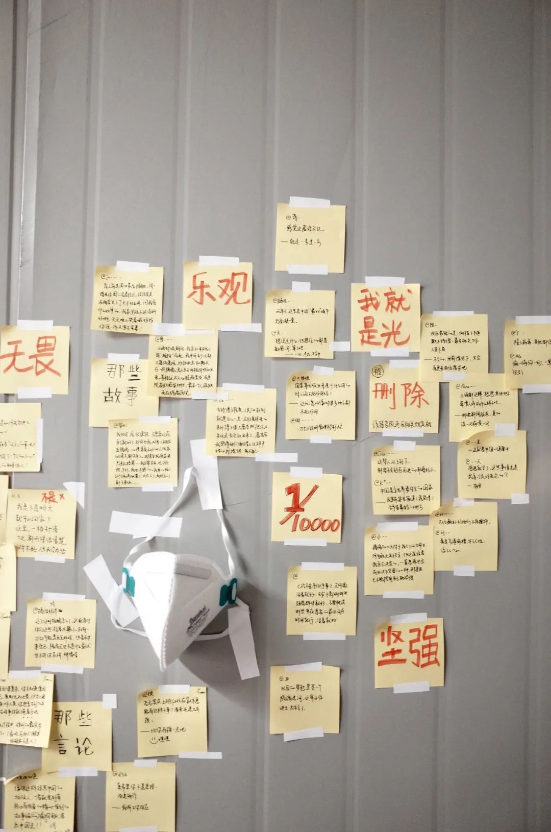 便利贴的粘性很差,想起来角落有一卷没用完的窗贴,我裁下一角,剪成一段段小胶带将所有便利贴固定好。中间留下一只我当时被转运来时戴的N95口罩。