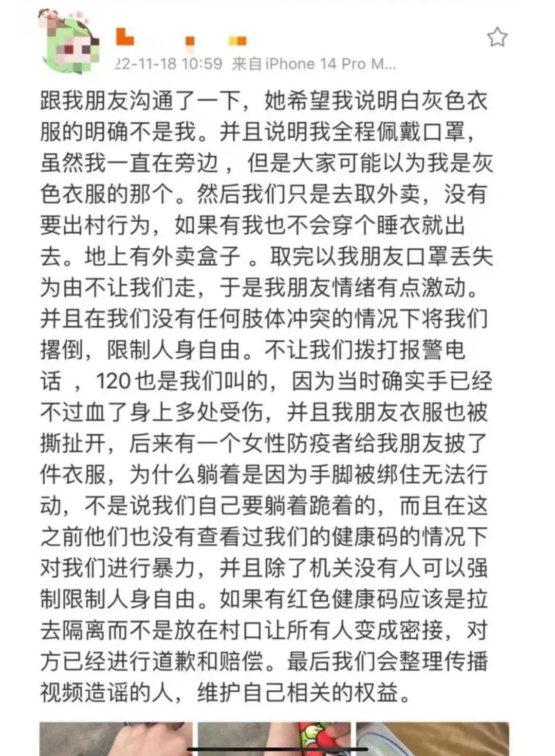 综合视频和当事女子的微博,事情经过已经非常清楚:两名女子(一名戴了口罩,一名不戴口罩)去村口取外卖,取完了被“志愿者”以“不戴口罩”为由刁难和阻截,两名女子遂与“志愿者”发生争吵。视频中清晰可听见,女子有用普通话骂“志愿者”,但“志愿者”同样也在用粤语骂两名女子。争吵当中,忽然有一名村“志愿者”用粤语恶狠狠地说:“唔好俾佢走(不要让她走)!”还有多名“志愿者”用粤语粗口辱骂女子,女子反唇相讥后,其他“志愿者”就拦住她们不让离去。随后,“志愿者”们便一拥而上将她们反绑并强按在地。