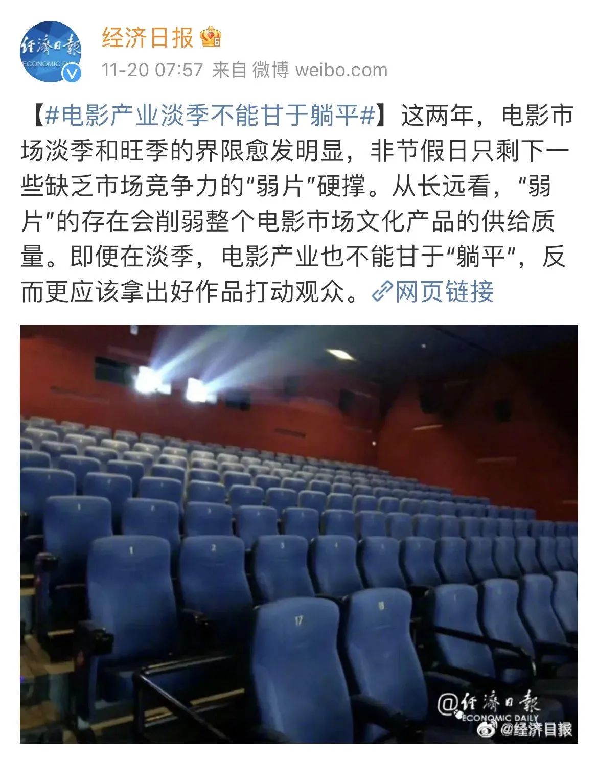 它的大概观点是,今年电影业不景气,是因为弱片实在太多,倒了观众的胃口。最后还不忘振臂高呼,电影人们不能甘于躺平,要努力生产好片,重振市场信心。