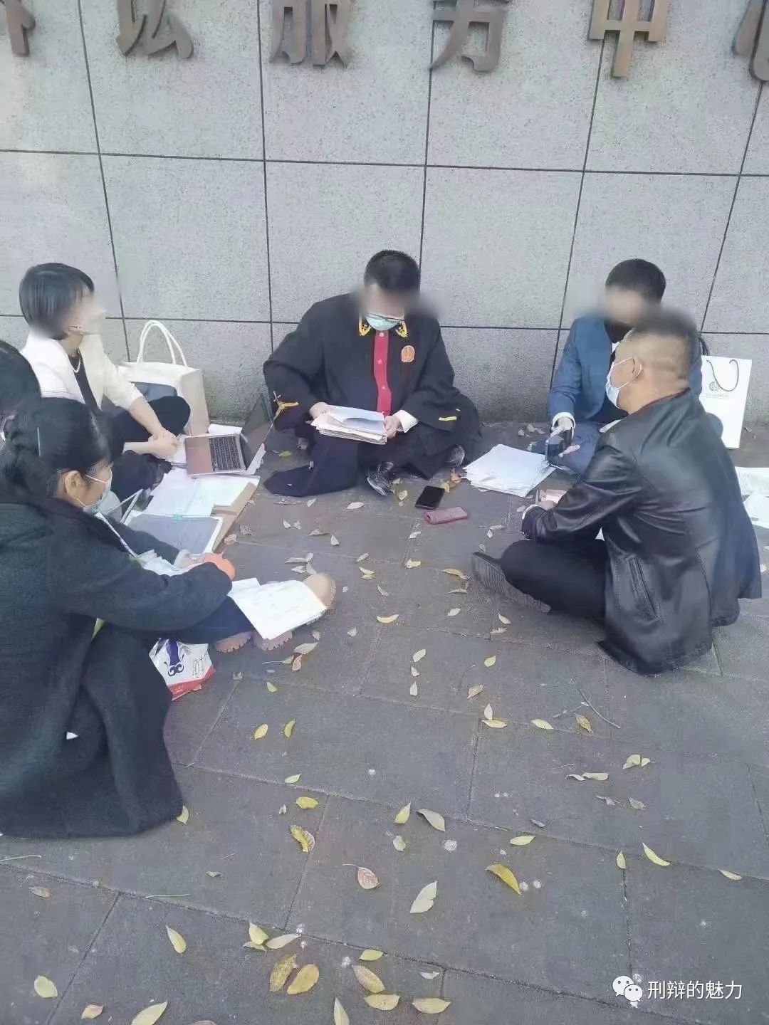 如图,新冠历三年11月23日,昆明市中级法院诉讼服务中心门口,落叶满地。法官身着法官袍,律师西装革履,原告、被告俱在,笔记本电脑、智能手机、诉讼材料都放在地上,所有人席地围坐,进行“街审”——疫情时代开庭的新形式。当然,每个人都要戴着口罩。