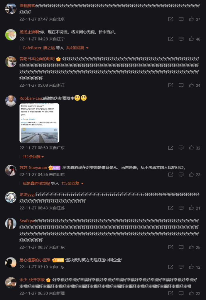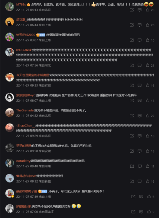 当然,有这样的“猪队友”配合也让外交部发言人赵立坚的处境变得更为被动,有网友注意到近期赵立坚的个人微博下翻车言论变得尤其多,例如在几天前出现的“好好好”行为艺术刷屏抗议也高频出现。