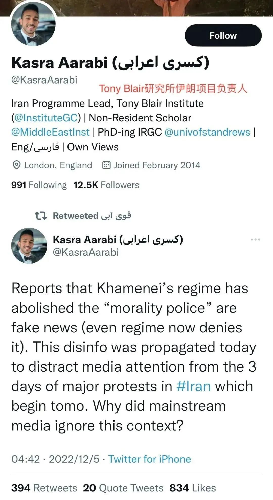 图源 @Twitter Kasra Aarabi,Tony Blair研究所伊朗项目负责人