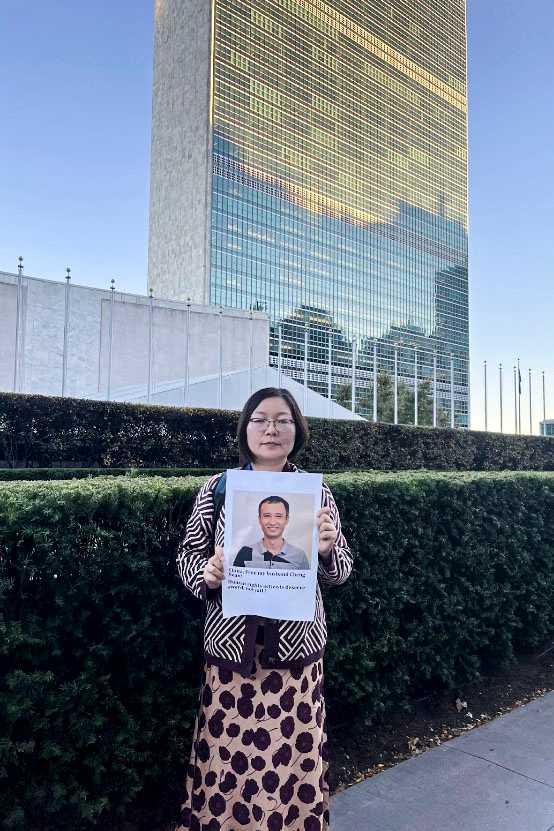 2022年10月,施明磊在联合国总部门前,举起程渊的照片,为他发声。图:受访者提供
