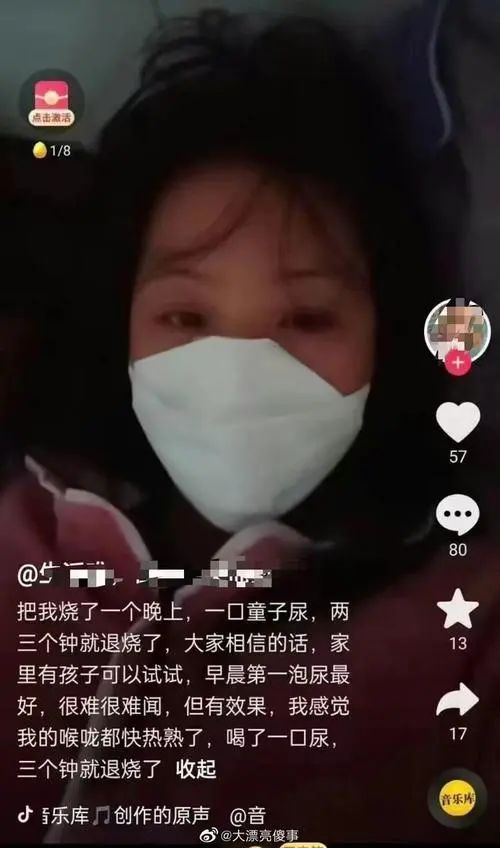 某音上甚至有人言辞凿凿说,童子尿能治病,自己早上喝了一泡热乎的,三分钟就感到舒服了。