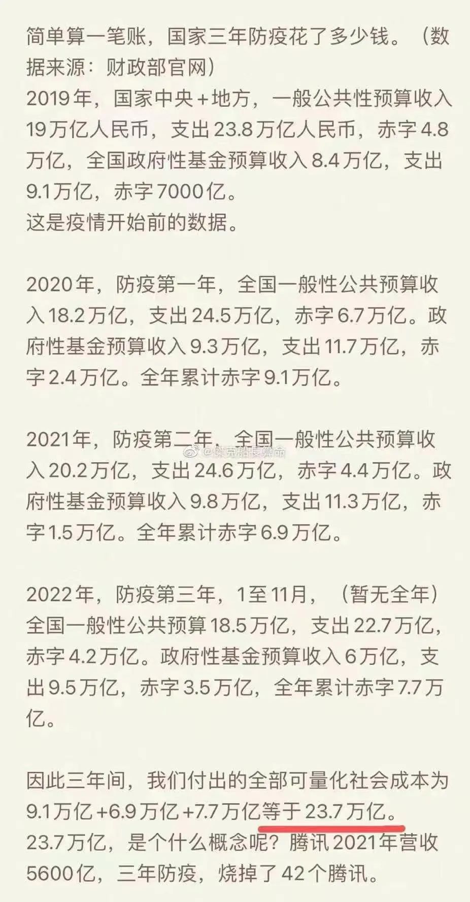 下面贴一张我看到的图片,关于三年内财政所支出的预算。23.7万亿。无论是购买P药用哪个计算方法,在以下这个费用计算的情况下,都真正称得上是九牛一毛。