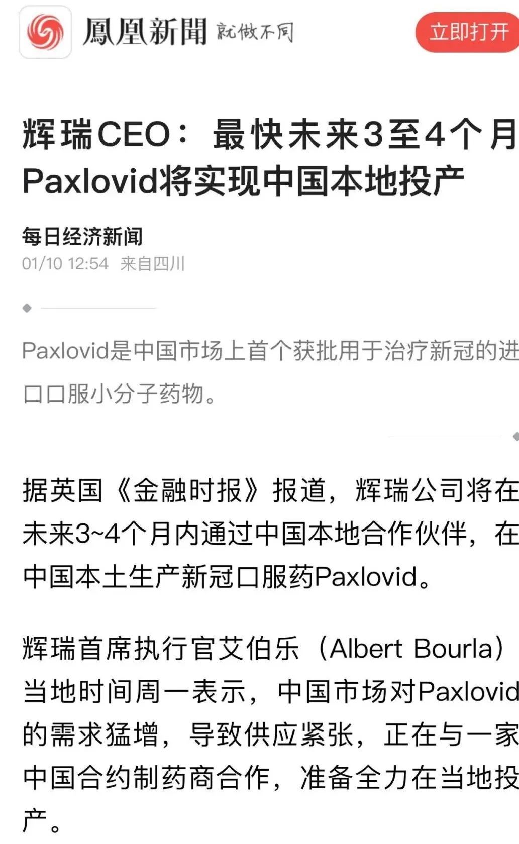 辉瑞CEO表示,最快未来3-4个月可以实现P药在中国本土投产。