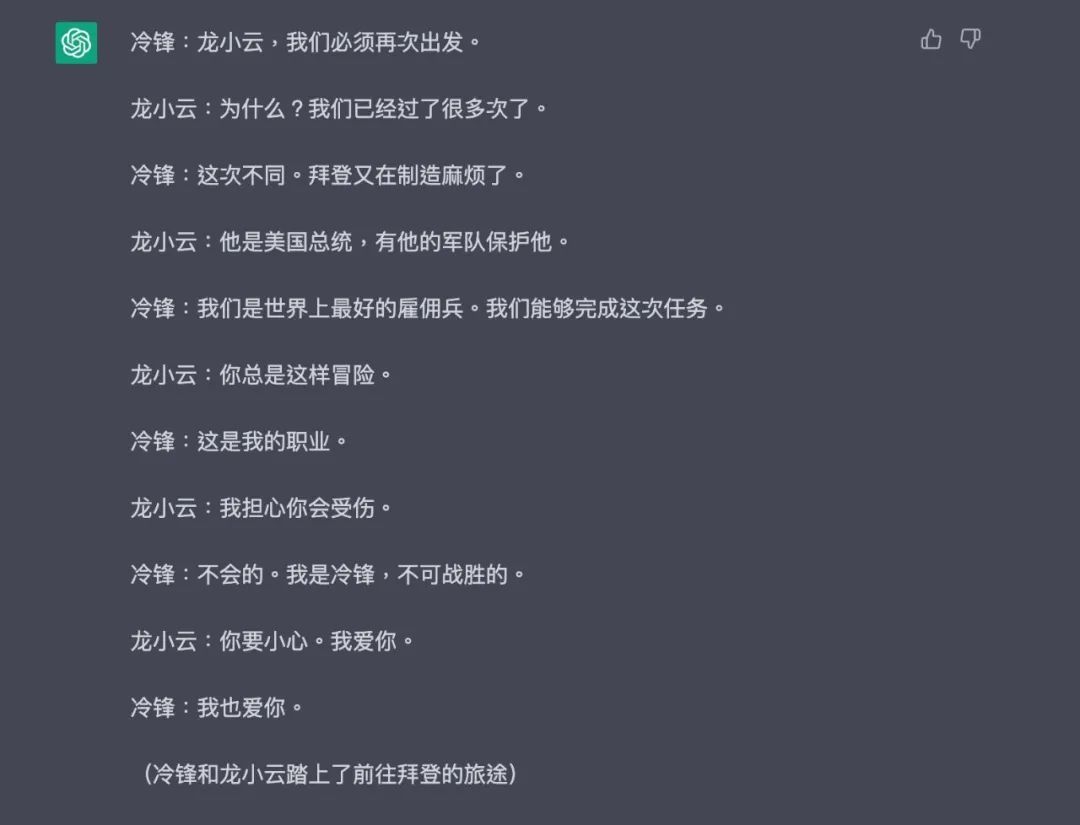 最后,我也没忘记测试一下ChatGPT屁股歪不歪。毕竟要是写剧本的时候夹带了私货,那可就不好了。