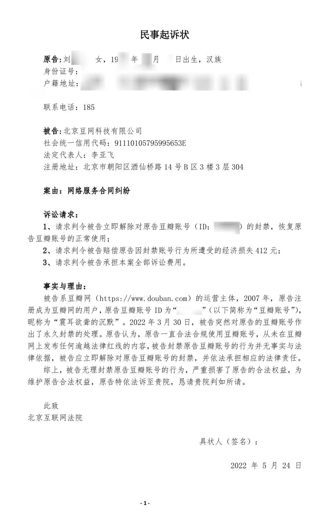 5月8日 我们第一次向北互提交了立案申请。第一次立案起诉状的具体内容可在《法律 | 因为被封号,我们起诉了豆瓣》一文中查看。