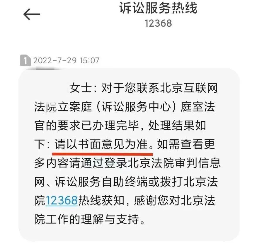 1.立案申请审核逾期。《北京互联网法院网上立案须知(试行)》第十二条规定:“立案法官自收到网上立案申请材料之日起七日内,在线审查起诉材料是否齐全,并通过短信告知结果。”但实际上,北互是在我们提交立案申请15天后,才告知审核结果,北互的审核期限已经逾期。而更讽刺的是,通过之后我们进一步的经历来看,北互半个月就反馈立案结果,甚至已经算得上很快的了。
